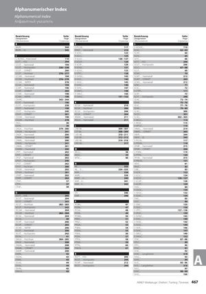 Alphanumerischer Index Alphanumerical index Алфавитный указатель Bezeichnung Seite Bezeichnung Seite Bezeichnung Seite Designation Page Designation Page Designation Page Обозначение Страница Обозначение Страница Обозначение Страница B E S BNVR… 344 E-PCLN... 117 S-ACKUC... 110 BNVR…-5L 345 EPMT… Hartmetall 210 SCAC… 62 – 63 E-SCFC... 123 SCAP... 64 C E-SCLC... 125 SCDC... 65 C-ACKUC... Hartmetall 110 E-SCLD… 126 – 127 SCFC... 66 CCFT… HSS 294 E-SCUP... 128 SCFT… HSS 296 CCGT… Hartmetall 194 E-SCXP... 129 SCGT… Hochpositiv 246 CCGT… Hochpositiv 236 – 238 E-SDQC... 131 SCLC... 67 – 68 CCGT… CERMET 260 E-SDUC... 133 SCLP... 69 CCGT… Hochhart 276 – 277 E-STFC... 138 SCMC... 70 CCGW… Hartmetall 194 E-SV95C... 143 SCMT… Hartmetall 212 CCGW… Hochhart 276 – 278 E-SVLC... 140 SCMT… CERMET 265 CCGW… WIPER 278 E-SVUC... 145 SCMX… Hartmetall 212 CCGX… Hartmetall 194 E-SVVC... 146 SCRC... 71 CCMT… Hartmetall 196 E-SVXC... 147 SCSC... 72 CCMT… CERMET 260 E-SWFC... 148 S-CTFP... 111 CCMX… Hartmetall 198 E-SWLC… 150 SCXP… 72 CCMX… WIPER 198 E-SWUC... 151 – 152 SCXT… Hochpositiv 246 CNVRC… 343 – 344 SDAC… 73 – 74 CCXT… Hartmetall 196 K SDHC... 75 – 76 CCXT… Hochpositiv 238 KCGX… Hartmetall 210 SDJC… 77 – 78 CDGT… Hartmetall 198 KCGX… Hochhart 286 SDNC... 79 – 80 CDGT… Hochpositiv 240 KCGX… Hochpositiv 244 SLAO... 300 CDGT… CERMET 261 KCGX… CERMET 264 SLCO... 301 CDGW… Hartmetall 198 KNMX… Hartmetall 211 SLXO... 302 – 303 CDGW… Hochhart 278 KNUX… Hartmetall 211 S-MCLC... 114 CKJC... 36 S-MSSC... 115 CKJN... 36 L S-MTUC... 116 CNGA… Hochhart 279 – 280 LAB 08… 304 – 307 SNMG… Hartmetall 214 CNGM… Hochpositiv 241 LST 08… 308 – 309 SNMG… CERMET 265 CNGP… Hartmetall 200 LVD 08… 310 – 311 SNVR… 344 CNMA… Hartmetall 200 LGE 08… 312 – 313 SNVR…-5L 345 CNMG… Hartmetall 200 LRD 08… 314 – 316 S-PCLN... 117 CNMG… Hochpositiv 241 LRO 08… 317 S-PDUN... 118 CNMG… CERMET 261 SPMR… Hartmetall 215 CNMM… Hartmetall 200 M SPMR… CERMET 266 CPET… Hartmetall 202 MCLC... 38 S-PSKN... 119 CPET… CERMET 262 MSSC... 39 S-PTFN... 120 CPGT… Hartmetall 202 MTJC... 46 SPUN… Hartmetall 215 CPGT… Hochpositiv 240 S-PWLN... 121 CPGT… CERMET 262 N SRDC... 81 CPGT… Hochhart 280 NL… 332 SRGC... 82 CPGW… Hartmetall 202 NL…V… 334 – 335 SSBC... 83 CPGW… Hochhart 281 NVR… 338 S-SCFC... 122 CPMT… Hartmetall 202 NVRC… 339 S-SCLC... 124 CPMT… CERMET 262 NVRC…U… 340 S-SCLD… 126 – 127 CTAP... 37 NVR…U… 341 S-SCUP... 128 CTFP... 37 NVR…V… 342 S-SCXP... 129 CTGP... 38 SSDC... 84 O S-SDQC... 130 D OV… 346 S-SDUC... 132 DCFT… HSS 295 OVR… 346 S-SDXC... 134 DCGT… Hartmetall 204 SSKC... 85 DCGT… CERMET 263 P SSSC… 86 DCGT… Hochhart 282 – 283 PCBN... 47 S-SSKC... 135 DCGT… Hochpositiv 242 PCKN... 47 S-SSSC... 136 DCGW… Hartmetall 204 PCLN... 48 S-STFC... 137 – 138 DCGW… Hochhart 282 – 284 PDJN... 49 S-STUC... 139 DCGX… Hartmetall 204 PDNN... 50 S-SV95C... 143 DCLN... 40 PRDC... 51 S-SVLC... 140 DCMT… Hartmetall 206 PRGC... 52 S-SVQC... 142 DCMT… CERMET 263 PRGN... 53 S-SVUC... 144 DCMX… WIPER 206 PSBN... 54 S-SVVC... 146 DCXT… Hartmetall 206 PSDN... 55 S-SVXC... 147 DCXT… Hochpositiv 242 PSKN... 56 S-SWLC... 149 DDJN... 41 PSSN... 57 S-SWUC... 152 DNGA… Hochhart 284 – 285 PTFN... 58 STAC... 87 – 88 DNGP… Hartmetall 208 PTGN... 59 STCC... 89 DNMG… Hartmetall 208 PTTN... 60 STFC... 90 DNMG… CERMET 264 PWLN... 61 STGC... 91 DNMP… Hartmetall 208 SVAC… 92 DSBN... 42 R SVAC… Langdrehen 318 DSDN...DSKN...DSSN... 43 RCFT… HSS 295 SVGC...43RCGT… Hochpositiv244SVHC...44RCMT… Hartmetall212SVJC...939495 – 96A DVJN... 44 RCXT… Hochpositiv 244 SVJC… Langdrehen 318 DVVN... 45 SVLC... 97 DWLN... 45 SVVC... 98 – 99 SVXC... 100 ARNO®-Werkzeuge | Drehen | Turning | Точение 467