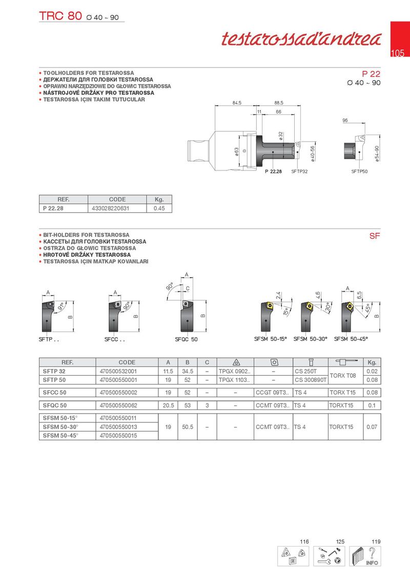 TRC 80 Ø 40 ~ 90 105 • TOOLHOLDERS FOR TESTAROSSA P 22 • ДЕРЖАТЕЛИ ДЛЯ ГОЛОВКИ TESTAROSSA Ø 40 ~ 90 • OPRAW.I NARZ}DZIOWE DO GOWIC TESTAROSSA • NÁSTROJOVÉ DR½Á.Y PRO TESTAROSSA • TESTAROSSA IqIN TA.IM TUTUCULAR REF. CODE Kg. P 22.28 433028220631 0.45 • BIT-HOLDERS FOR TESTAROSSA SF • КАССЕТЫ ДЛЯ ГОЛОВКИ TESTAROSSA • OSTRZA DO GOWIC TESTAROSSA • HROTOVÉ DR½Á.Y TESTAROSSA • TESTAROSSA IqIN MAT.AP .OVANLARI REF. CODE A B C Kg. SFTP 32 470500532001 11.5 34.5 t TPGX 0902.. t &67 TORX T08 0.02 SFTP 50 470500550001 19 52 t TPGX 1103.. t &67 0.08 SFCC 50 470500550002 19 52 t t &&*77 TS 4 TORX T15 0.08 SFQC 50 470500550062 20.5 53 3 t &&077 TS 4 TORXT15 0.1 SFSM 50-15° 470500550011 SFSM 50-30° 470500550013 19 50.5 t t &&077 TS 4 TORXT15 0.07 SFSM 50-45° 470500550015 116 125 119
