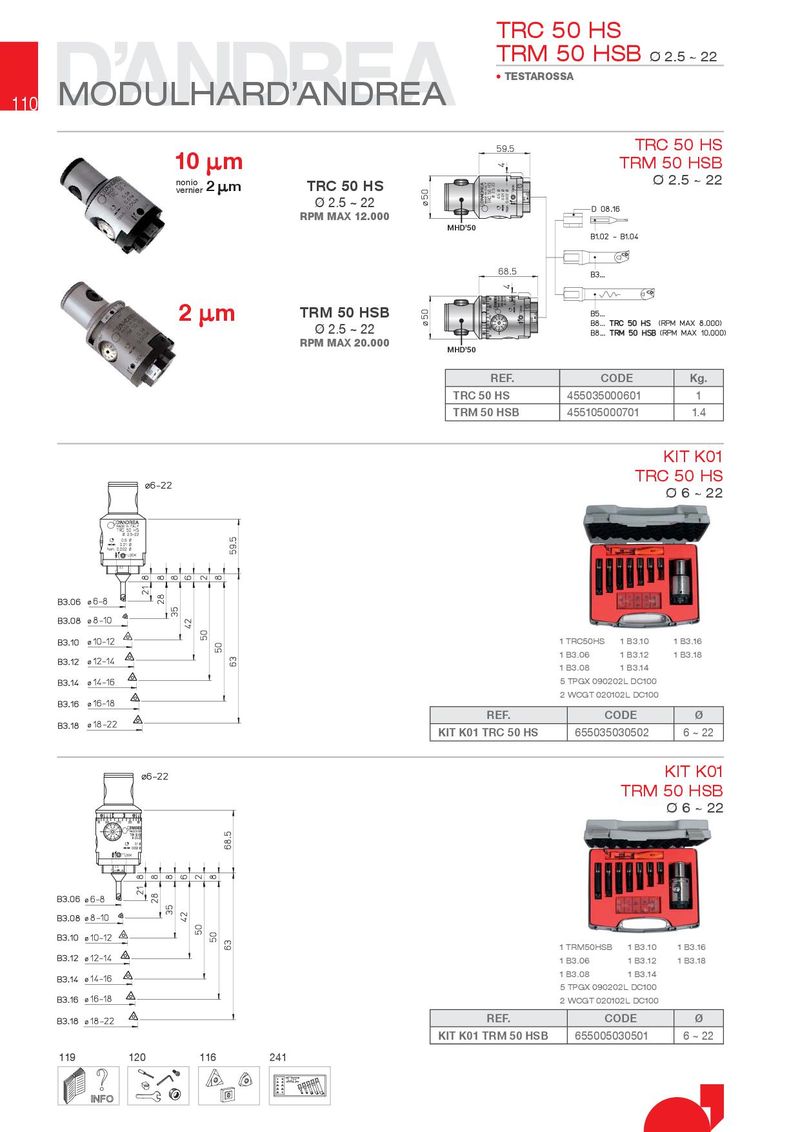 TRC 50 HS TRM 50 HSB Ø 2.5 ~ 22 MODULHARD’ANDREA • TESTAROSSA 110 10 m TRC 50 HS TRM 50 HSB 2 nonio m TRC 50 HS Ø 2.5 ~ 22 YHUQLHU Ø 2.5 ~ 22 RPM MAX 12.000 MHD’50 2 m TRM 50 HSB Ø 2.5 ~ 22 RPM MAX 20.000 MHD’50 REF. CODE Kg. TRC 50 HS 455035000601 1 TRM 50 HSB 455105000701 1.4 KIT K01 TRC 50 HS Ø 6 ~ 22 1 TRC50HS 1 B3.10 1 B3.16 1 B3.06 1 B3.12 1 B3.18 1 B3.08 1 B3.14 5 TPGX 090202L DC100 2 WCGT 020102L DC100 REF. CODE Ø KIT K01 TRC 50 HS 655035030502 6 ~ 22 KIT K01 TRM 50 HSB Ø 6 ~ 22 1 TRM50HSB 1 B3.10 1 B3.16 1 B3.06 1 B3.12 1 B3.18 1 B3.08 1 B3.14 5 TPGX 090202L DC100 2 WCGT 020102L DC100 REF. CODE Ø KIT K01 TRM 50 HSB 655005030501 6 ~ 22 119 120 116 241
