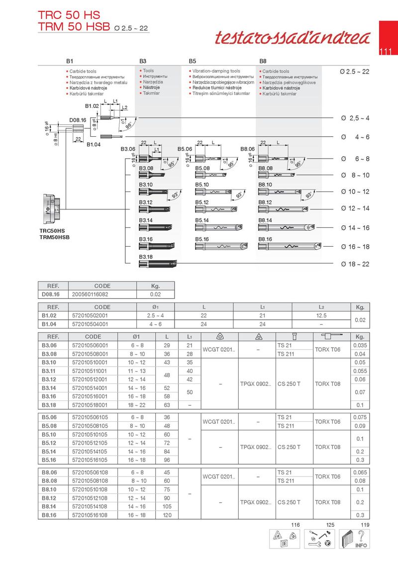 TRC 50 HS TRM 50 HSB Ø 2.5 ~ 22 111 B1 B3 B5 B8 •&DUELGHWRROV • Tools • Vibration-damping tools •&DUELGHWRROV Ø 2.5 ~ 22 • Твердосплавные инструменты • Инструменты • Виброизоляционные инструменты • Твердосплавные инструменты •1DU]ĸG]LD]WZDUGHJRPHWDOX •1DU]ĸG]LD •1DU]ĸG]LD]DSRELHJDMĝFHZLEUDFMRP •1DU]ĸG]LDSHŕQRZĸJOLNRZH •.DUELGRYÆQ¾VWURMH •1¾VWURMH •5HGXNFHWOXPÊFÊQ¾VWURMH •.DUELGRYÆQ¾VWURMH •.DUEÙUOÙWDNIJPODU •7DNIJPODU •7LWUHūLPVÓQÙPOH\LFLWDNIJPODU •.DUEÙUOÙWDNIJPODU L L1 B1.02 L2 16 g6 D08.16 Ø 8 g5 Ø1 Ø 2,5 ~ 4 96° Ø H6 Ø 4~6 8 22 22 L 22 L 22 L Ø B1.04 B3.06 L1 B5.06 B8.06 g5 g5 g5 16 Ø1 95° 16 Ø1 95° 16 Ø1 95° Ø 6~8 Ø B3.08 Ø B5.08 Ø B8.08 Ø 8 ~ 10 B3.10 B5.10 B8.10 93° 93° 93° Ø 10 ~ 12 B3.12 B5.12 B8.12 Ø 12 ~ 14 B3.14 B5.14 B8.14 TRC50HS Ø 14 ~ 16 TRM50HSB B3.16 B5.16 B8.16 Ø 16 ~ 18 B3.18 Ø 18 ~ 22 REF. CODE Kg. D08.16 200560116082 0.02 REF. CODE Ø1 L L1 L2 Kg. B1.02 572010502001 2.5 ~ 4 22 21 12.5 0.02 B1.04 572010504001 4~6 24 24 t REF. CODE Ø1 L L1 Kg. B3.06 572010506001 6~8 29 21 :&*7 t TS 21 TORX T06 0.035 B3.08 572010508001 8 ~ 10 36 28 TS 211 0.04 B3.10 572010510001 10 ~ 12 43 35 0.05 B3.11 572010511001 11 ~ 13 48 40 0.055 B3.12 572010512001 12 ~ 14 42 t TPGX 0902.. &67 TORX T08 0.06 B3.14 572010514001 14 ~ 16 52 50 0.07 B3.16 572010516001 16 ~ 18 58 B3.18 572010518001 18 ~ 22 63 t 0.1 B5.06 572010506105 6~8 36 :&*7 t TS 21 TORX T06 0.075 B5.08 572010508105 8 ~ 10 48 TS 211 0.09 B5.10 572010510105 10 ~ 12 60 t 0.1 B5.12 572010512105 12 ~ 14 72 t TPGX 0902.. &67 TORX T08 B5.14 572010514105 14 ~ 16 84 0.2 B5.16 572010516105 16 ~ 18 96 0.3 B8.06 572010506108 6~8 45 :&*7 t TS 21 TORX T06 0.065 B8.08 572010508108 8 ~ 10 60 TS 211 0.08 B8.10 572010510108 10 ~ 12 75 t 0.1 B8.12 572010512108 12 ~ 14 90 t TPGX 0902.. &67 TORX T08 0.2 B8.14 572010514108 14 ~ 16 105 B8.16 572010516108 16 ~ 18 120 0.3 116 125 119