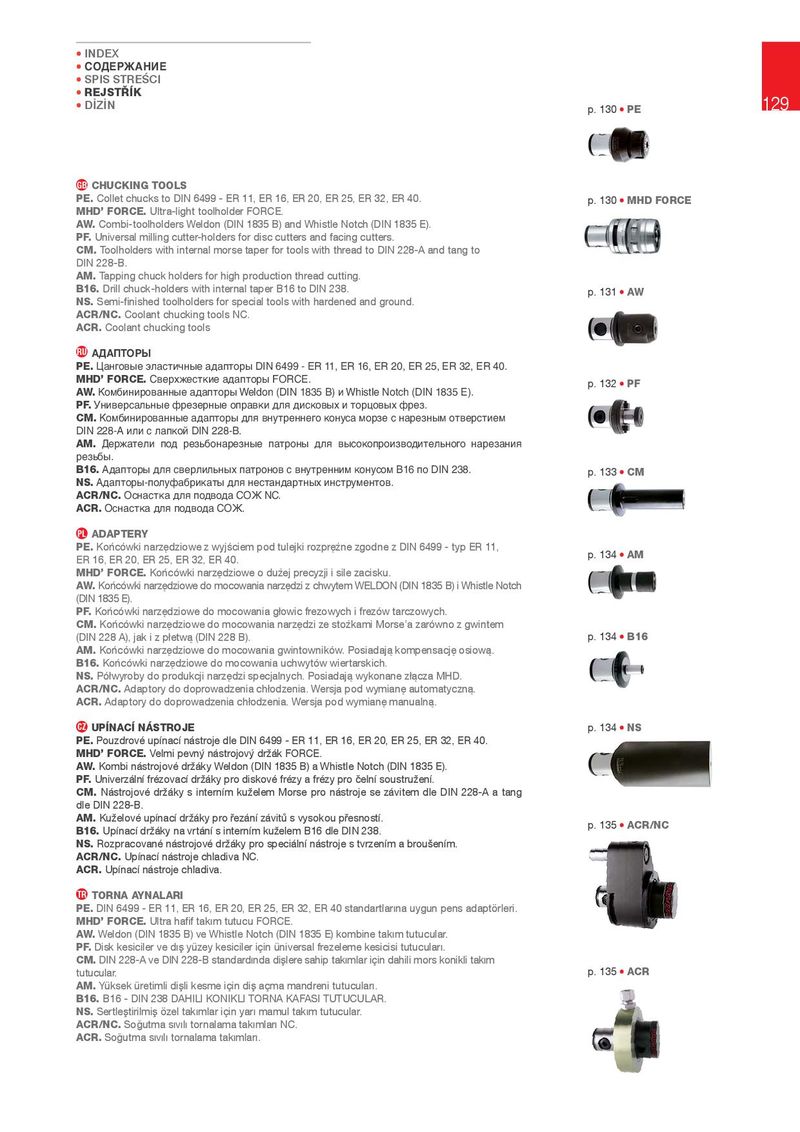 • INDEX • СОДЕРЖАНИЕ • SPIS STREùCI • REJST¢ . 129 • Dá9áN p. 130 • PE GB CHUC.ING TOOLS PE. Collet chucks to DIN 6499 - ER 11, ER 16, ER 20, ER 25, ER 32, ER 40. p. 130 • MHD FORCE MHD’ FORCE. Ultra-light toolholder FORCE. AW. Combi-toolholders Weldon (DIN 1835 B) and Whistle Notch (DIN 1835 E). PF. Universal milling cutter-holders for disc cutters and facing cutters. CM. Toolholders with internal morse taper for tools with thread to DIN 228-A and tang to DIN 228-B. AM. Tapping chuck holders for high production thread cutting. B16. Drill chuck-holders with internal taper B16 to DIN 238. p. 131 • AW NS. 6HPLĺQLVKHGWRROKROGHUVIRUVSHFLDOWRROVZLWKKDUGHQHGDQGJURXQG ACR/NC. Coolant chucking tools NC. ACR. Coolant chucking tools RU АДАПТОРЫ PE. Цанговые эластичные адапторы DIN 6499 - ER 11, ER 16, ER 20, ER 25, ER 32, ER 40. MHD’ FORCE. Сверхжесткие адапторы FORCE. p. 132 • PF AW. Комбинированные адапторы Weldon (DIN 1835 B) и Whistle Notch (DIN 1835 E). PF. Универсальные фрезерные оправки для дисковых и торцовых фрез. CM. Комбинированные адапторы для внутреннего конуса морзе с нарезным отверстием DIN 228-A или с лапкой DIN 228-B. AM. Держатели под резьбонарезные патроны для высокопроизводительного нарезания резьбы. B16. Адапторы для сверлильных патронов с внутренним конусом B16 по DIN 238. p. 133 • CM NS. Адапторы-полуфабрикаты для нестандартных инструментов. ACR/NC. Оснастка для подвода СОЖ NC. ACR. Оснастка для подвода СОЖ. PL ADAPTERY PE..RŘFÐZNLQDU]ĸG]LRZH]Z\MŪFLHPSRGWXOHMNLUR]SUĸƅQH]JRGQH]',1W\S(5 p. 134 • AM ER 16, ER 20, ER 25, ER 32, ER 40. MHD’ FORCE..RŘFÐZNLQDU]ĸG]LRZHRGXƅHMSUHF\]MLLVLOH]DFLVNX AW..RŘFÐZNLQDU]ĸG]LRZHGRPRFRZDQLDQDU]ĸG]L]FKZ\WHP:(/'21',1%L:KLVWOH1RWFK (DIN 1835 E). PF. .RŘFÐZNLQDU]ĸG]LRZHGRPRFRZDQLDJŕRZLFIUH]RZ\FKLIUH]ÐZWDUF]RZ\FK CM..RŘFÐZNLQDU]ĸG]LRZHGRPRFRZDQLDQDU]ĸG]L]HVWRƅNDPL0RUVHpD]DUÐZQR]JZLQWHP ',1$MDNL]SŕHWZĝ',1% p. 134 • B16 AM. .RŘFÐZNLQDU]ĸG]LRZHGRPRFRZDQLDJZLQWRZQLNÐZ3RVLDGDMĝNRPSHQVDFMĸRVLRZĝ B16..RŘFÐZNLQDU]ĸG]LRZHGRPRFRZDQLDXFKZ\WÐZZLHUWDUVNLFK NS.3ÐŕZ\URE\GRSURGXNFMLQDU]ĸG]LVSHFMDOQ\FK3RVLDGDMĝZ\NRQDQH]ŕĝF]D0+' ACR/NC.$GDSWRU\GRGRSURZDG]HQLDFKŕRG]HQLD:HUVMDSRGZ\PLDQĸDXWRPDW\F]Qĝ ACR.$GDSWRU\GRGRSURZDG]HQLDFKŕRG]HQLD:HUVMDSRGZ\PLDQĸPDQXDOQĝ CZ UP NAC NÁSTROJE p. 134 • NS PE.3RX]GURYÆXSÊQDFÊQ¾VWURMHGOH',1(5(5(5(5(5(5 MHD’ FORCE. 9HOPLSHYQÚQ¾VWURMRYÚGU{¾N)25&( AW. .RPELQ¾VWURMRYÆGU{¾N\:HOGRQ',1%D:KLVWOH1RWFK',1( PF. 8QLYHU]¾OQÊIUÆ]RYDFÊGU{¾N\SURGLVNRYÆIUÆ]\DIUÆ]\SURĦHOQÊVRXVWUX{HQÊ CM. 1¾VWURMRYÆGU{¾N\VLQWHUQÊPNX{HOHP0RUVHSURQ¾VWURMHVH]¾YLWHPGOH',1$DWDQJ dle DIN 228-B. AM. .X{HORYÆXSÊQDFÊGU{¾N\SURŦH]¾QÊ]¾YLWƀVY\VRNRXSŦHVQRVWÊ p. 135 • ACR/NC B16. 8SÊQDFÊGU{¾N\QDYUW¾QÊVLQWHUQÊPNX{HOHP%GOH',1 NS. 5R]SUDFRYDQÆQ¾VWURMRYÆGU{¾N\SURVSHFL¾OQÊQ¾VWURMHVWYU]HQÊPDEURXxHQÊP ACR/NC. 8SÊQDFÊQ¾VWURMHFKODGLYD1& ACR. 8SÊQDFÊQ¾VWURMHFKODGLYD. TR TORNA AYNALARI PE.',1(5(5(5(5(5(5VWDQGDUWODUIJQDX\JXQSHQVDGDSWÓUOHUL MHD’ FORCE.8OWUDKDĺIWDNIJPWXWXFX)25&( AW.:HOGRQ',1%YH:KLVWOH1RWFK',1(NRPELQHWDNIJPWXWXFXODU PF.'LVNNHVLFLOHUYHGIJū\Ù]H\NHVLFLOHULÄLQÙQLYHUVDOIUH]HOHPHNHVLFLVLWXWXFXODUIJ CM.',1$YH',1%VWDQGDUGIJQGDGLūOHUHVDKLSWDNIJPODULÄLQGDKLOLPRUVNRQLNOLWDNIJP tutucular. p. 135 • ACR AM.<ÙNVHNÙUHWLPOLGLūOLNHVPHLÄLQGLūDÄPDPDQGUHQLWXWXFXODUIJ B16. %',1'$+,/,.21,./,7251$.$)$6,7878&8/$5 NS.6HUWOHūWLULOPLūÓ]HOWDNIJPODULÄLQ\DUIJPDPXOWDNIJPWXWXFXODU ACR/NC.6RĽXWPDVIJYIJOIJWRUQDODPDWDNIJPODUIJ1& ACR.6RĽXWPDVIJYIJOIJWRUQDODPDWDNIJPODUIJ