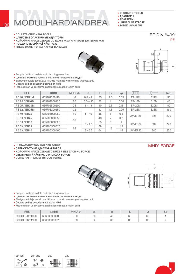 • CHUC.ING TOOLS • АДАПТОРЫ MODULHARD’ANDREA • ADAPTERY 130 • UP NAC NÁSTROJE • TORNA AYNALARI • COLLETS CHUC.ING TOOLS ER DIN 6499 • ЦАНГОВЫЕ ЭЛАСТИЧНЫЕ АДАПТОРЫ PE • .OCÓW.I NARZ}DZIOWE DO ELASTYCZNYCH TULEI ZACIS.OWYCH • POUZDROVÉ UP NAC NÁSTROJE • FREZE qA.ILI TORNA .AFASI TA.IMLARI • Supplied without collets and clamping wrenches • Цанги и зажимные ключи в комплект поставки не входят • (ODVW\F]QHWXOHMH]DFLVNRZHLNOXF]HPRQWDƅRZHQLHVĝQDZ\SRVDƅHQLX • 'RG¾Y¾VHEH]SRX]GHUDXSÊQDFÊFKNOÊĦƀ • )UH]HÄDNIJODUIJYHVIJNIJūWIJUPDDQDKWDUODUIJROPDGDQWHVOLPHGLOLU REF. CODE MHD’ d1 d L L1 kg N·m PE 16 / ER11M 655701600110 16 0.5 ~ 7 25 2.5 0.03 ER-11M E11M 30 PE 20 / ER16M 655702000160 20 0.5 ~ 10 32 1 0.06 ER-16M E16M 40 PE 25 / ER20M 655702500200 25 1 ~ 13 40 2.5 0.15 ER-20M E20M 80 PE 32 / ER25M 655703200250 32 42 1.5 0.25 ER-25M E25M 160 PE 40 / ER25 655704000250 40 1 ~ 16 45 5 0.4 80(5 E25 200 PE 50 / ER25 655705000250 50 48 7 0.7 PE 50 / ER32 655705000320 2 ~ 20 55 8 1 80(5 E32 220 PE 63 / ER32 655706300320 63 59 12 1.3 PE 63 / ER40 655706300400 3 ~ 26 64 1.5 80(5 E40 250 • ULTRA-TIGHT TOOLHOLDER FORCE MHD’ FORCE • СВЕРХЖЕСТКИЕ АДАПТОРЫ FORCE • .OCÓW.I NARZ}DZIOWE O DU¾EJ SILE ZACIS.U FORCE • VELMI PEVN¹ NÁSTROJOV¹ DR½Á. FORCE • ULTRA HAFIF TA.IM TUTUCU FORCE • Supplied without collets and clamping wrenches • Цанги и зажимные ключи в комплект поставки не входят • (ODVW\F]QHWXOHMH]DFLVNRZHLNOXF]HPRQWDƅRZHQLHVĝQDZ\SRVDƅHQLX • 'RG¾Y¾VHEH]SRX]GHUDXSÊQDFÊFKNOÊĦƀ • )UH]HÄDNIJODUIJYHVIJNIJūWIJUPDDQDKWDUODUIJROPDGDQWHVOLPHGLOLU REF. CODE MHD’ d1 d2 d3 L L1 kg FORCE 50/20 HS 656305000205 50 20 48 60 60 1 FORCE 63/32 HS 656306300325 63 32 66 80 80 2 120-136 241-242 222 222