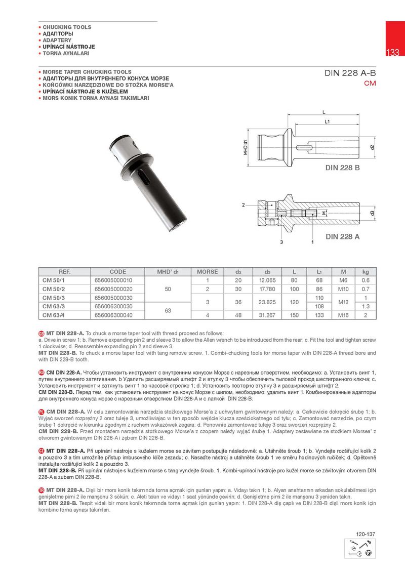 • CHUC.ING TOOLS • АДАПТОРЫ • ADAPTERY • UP NAC NÁSTROJE 133 • TORNA AYNALARI • MORSE TAPER CHUC.ING TOOLS DIN 228 A-B • АДАПТОРЫ ДЛЯ ВНУТРЕННЕГО КОНУСА МОРЗЕ CM • .OCÓW.I NARZ}DZIOWE DO STO¾.A MORSE’A • UP NAC NÁSTROJE S .U½ELEM • MORS .ONI. TORNA AYNASI TA.IMLARI DIN 228 B DIN 228 A REF. CODE MHD’ d1 MORSE d2 d3 L L1 M kg CM 50/1 656005000010 1 20 12.065 80 68 M6 0.6 CM 50/2 656005000020 50 2 30 17.780 100 86 M10 0.7 CM 50/3 656005000030 3 36 23.825 120 110 M12 1 CM 63/3 656006300030 63 108 1.3 CM 63/4 656006300040 4 48 31.267 150 133 M16 2 GB MT DIN 228-A. 7RFKXFNDPRUVHWDSHUWRROZLWKWKUHDGSURFHHGDVIROORZV D'ULYHLQVFUHZE5HPRYHH[SDQGLQJSLQDQGVOHHYHWRDOORZWKH$OOHQZUHQFKWREHLQWURGXFHGIURPWKHUHDUF)LWWKHWRRODQGWLJKWHQVFUHZ FORFNZLVHG5HDVVHPEOHH[SDQGLQJSLQDQGVOHHYH MT DIN 228-B. 7RFKXFNDPRUVHWDSHUWRROZLWKWDQJUHPRYHVFUHZ&RPELFKXFNLQJWRROVIRUPRUVHWDSHUZLWK',1$WKUHDGERUHDQG ZLWK',1%WRRWK RU CM DIN 228-A. Чтобы установить инструмент с внутренним конусом Морзе с нарезным отверстием, необходимо: а. Установить винт 1, путем внутреннего затягивания. b Удалить расширяемый штифт 2 и втулку 3 чтобы обеспечить тыловой проход шестигранного ключа; с. Установить инструмент и затянуть винт 1 по часовой стрелке 1; d. Установить повторно втулку 3 и расширяемый штифт 2. CM DIN 228-B. Перед тем, как установить инструмент на конус Морзе с шипом, необходимо: удалить винт 1. Комбинированные адапторы для внутреннего конуса морзе с нарезным отверстием DIN 228-A и с лапкой DIN 228-B. PL CM DIN 228-A.:FHOX]DPRQWRZDQLDQDU]ĸG]LDVWRƅNRZHJR0RUVHpD]XFKZ\WHPJZLQWRZDQ\PQDOHƅ\D&DŕNRZLFLHGRNUĸFLġŪUXEĸE :\MĝġVZRU]HŘUR]SUĸƅQ\RUD]WXOHMĸXPRƅOLZLDMĝFZWHQVSRVÐEZHMŪFLHNOXF]DV]HŪFLRNĝWQHJRRGW\ŕXF=DPRQWRZDġQDU]ĸG]LHSRF]\P ŪUXEĸGRNUĸFLġZNLHUXQNX]JRGQ\P]UXFKHPZVND]ÐZHN]HJDUDG3RQRZQLH]DPRQWRZDġWXOHMĸRUD]VZRU]HŘUR]SUĸƅQ\ CM DIN 228-B.3U]HGPRQWDƅHPQDU]ĸG]LDVWRƅNRZHJR0RUVHpD]F]RSHPQDOHƅ\Z\MĝġŪUXEĸ$GDSWHU\]HVWDZLDQH]HVWRƅNLHP0RUVHDp] RWZRUHPJZLQWRZDQ\P',1$L]ĸEHP',1% CZ MT DIN 228-A.3ŦLXSÊQ¾QÊQ¾VWURMHVNX{HOHPPRUVHVH]¾YLWHPSRVWXSXMWHQ¾VOHGRYQĵD8W¾KQĵWHxURXEE9\QGHMWHUR]xLŦXMÊFÊNROÊN DSRX]GURDWÊPXPR{QÊWHSŦÊVWXSLPEXVRYÆKRNOÊĦH]H]DGXF1DVDĭWHQ¾VWURMDXW¾KQĵWHxURXEYHVPĵUXKRGLQRYÚFKUXĦLĦHNG2SĵWRYQĵ LQVWDOXMWHUR]xLŦXMÊFÊNROÊNDSRX]GUR MT DIN 228-B.3ŦLXSÊQ¾QÊQ¾VWURMHVNX{HOHPPRUVHVWDQJY\QGHMWHxURXE.RPELXSÊQDFÊQ¾VWURMHSURNX{HOPRUVHVH]¾YLWRYÚPRWYRUHP',1 $D]XEHP',1% TR MT DIN 228-A.'LūOLELUPRUVNRQLNWDNIJPIJQGDWRUQDDÄPDNLÄLQūXQODUIJ\DSIJQD9LGD\IJWDNIJQE$O\DQDQDKWDUIJQIJQDUNDGDQVRNXODELOPHVLLÄLQ JHQLūOHWPHSLPLLOHPDQūRQXVÓNÙQF$OHWLWDNIJQYHYLGD\IJVDDW\ÓQÙQGHÄHYLULQG*HQLūOHWPHSLPLLOHPDQūRQX\HQLGHQWDNIJQ MT DIN 228-B.7HVSLWYLGDOIJELUPRUVNRQLNWDNIJPIJQGDWRUQDDÄPDNLÄLQūXQODUIJ\DSIJQ',1$GLūÄDSOIJYH',1%GLūOLPRUVNRQLNLÄLQ NRPELQHWRUQDD\QDVIJWDNIJPODUIJ 120-137