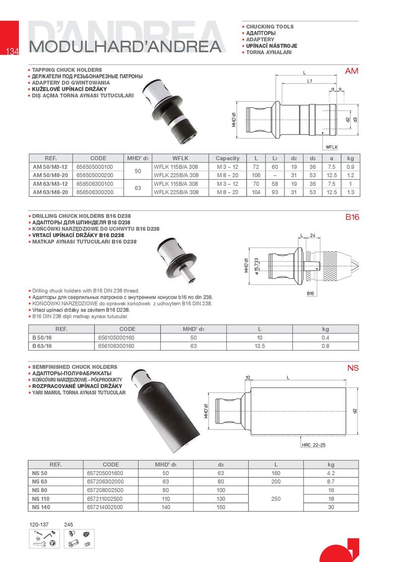 • CHUC.ING TOOLS • АДАПТОРЫ MODULHARD’ANDREA • ADAPTERY 134 • UP NAC NÁSTROJE • TORNA AYNALARI • TAPPING CHUC. HOLDERS AM • ДЕРЖАТЕЛИ ПОД РЕЗЬБОНАРЕЗНЫЕ ПАТРОНЫ • ADAPTERY DO GWINTOWANIA • .U½ELOVÉ UP NAC DR½Á.Y • DI§ AqMA TORNA AYNASI TUTUCULARI REF. CODE MHD’ d1 WFLK Capacity L L1 d2 d3 a kg AM 50/M3-12 656505000100 50 :)/.%$ M 3 ~ 12 72 60 19 36 7.5 0.9 AM 50/M8-20 656505000200 :)/.%$ M 8 ~ 20 106 t 31 53 12.5 1.2 AM 63/M3-12 656506300100 63 :)/.%$ M 3 ~ 12 70 58 19 36 7.5 1 AM 63/M8-20 656506300200 :)/.%$ M 8 ~ 20 104 93 31 53 12.5 1.3 • DRILLING CHUC. HOLDERS B16 D238 B16 • АДАПТОРЫ ДЛЯ ШПИНДЕЛЯ B16 D238 • .OCÓW.I NARZ}DZIOWE DO UCHWYTU B16 D238 • VRTAC UP NAC DR½Á.Y B16 D238 • MAT.AP AYNASI TUTUCULARI B16 D238 • 'ULOOLQJFKXFNKROGHUVZLWK%',1WKUHDG • Адапторы для сверлильных патронов с внутренним конусом b16 по din 238. • .2þ&°:.,1$5=ë'=,2:(GRRSUDZHNNRŘFÐZHN]XFKZ\WHP%',1 • 9UWDFÊXSÊQDFÊGU{¾N\VH]¾YLWHP%' • %',1GLūOLPDWNDSD\QDVIJWXWXFXODU REF. CODE MHD’ d1 L kg B 50/16 656105000160 50 10 0.4 B 63/16 656106300160 63 13.5 0.8 • SEMIFINISHED CHUC. HOLDERS NS • АДАПТОРЫ-ПОЛУФАБРИКАТЫ • .OCÓW.I NARZ}DZIOWE ò PÓPRODU.TY • ROZPRACOVANÉ UP NAC DR½Á.Y • YARI MAMUL TORNA AYNASI TUTUCULAR REF. CODE MHD’ d1 d2 L kg NS 50 657205001600 50 63 160 4.2 NS 63 657206302000 63 80 200 8.7 NS 80 657208002500 80 100 16 NS 110 657211002500 110 130 250 18 NS 140 657214002500 140 150 30 120-137 245