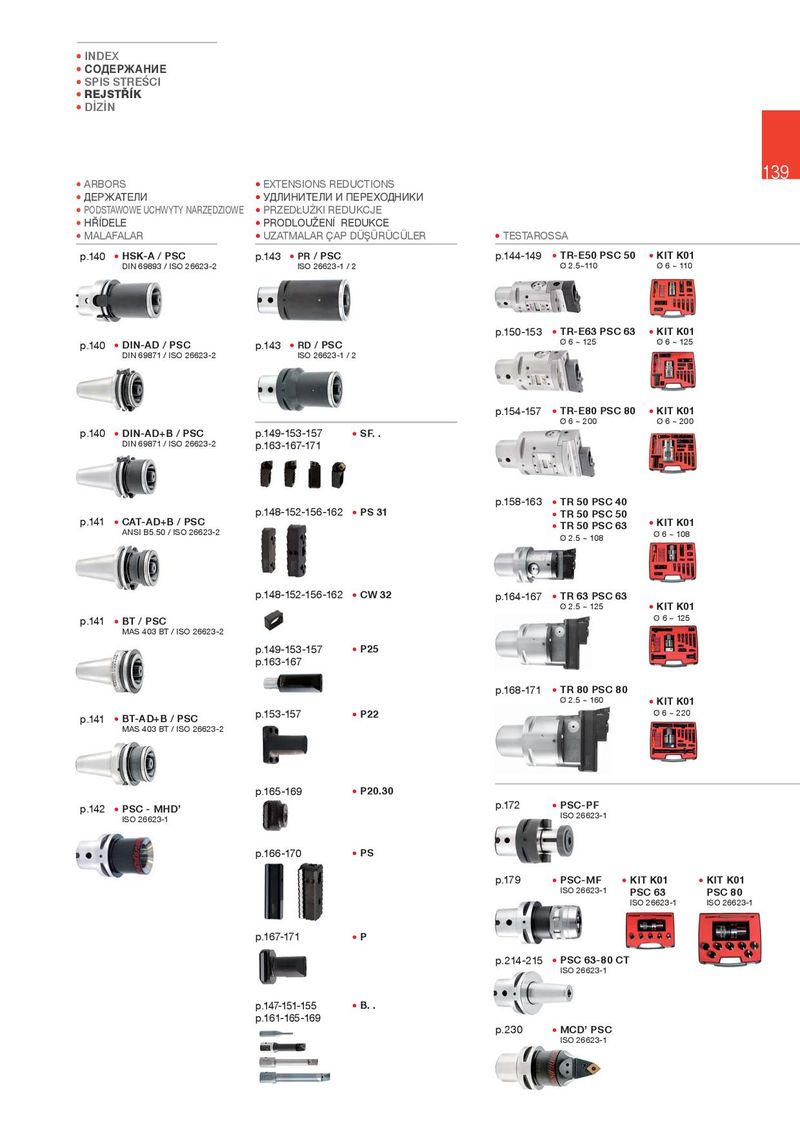 • INDEX • СОДЕРЖАНИЕ • SPIS STREùCI • REJST¢ . • Dá9áN • ARBORS • EXTENSIONS REDUCTIONS 139 • ДЕРЖАТЕЛИ • УДЛИНИТЕЛИ И ПЕРЕХОДНИКИ • 32'67$:2:(8&+:<7<1$5=ë'=,2:( • 35=('ý8Ę.,5('8.&-( • +Ćª'(/( • 352'/28n(1ª5('8.&( •0$/$)$/$5 • 8=$70$/$5¤$3'¹ĉ¹5¹&¹/(5 • TESTAROSSA p.140 • HSK-A / PSC p.143 • PR / PSC p.144-149 • TR-E50 PSC 50 • KIT K01 DIN 69893 / ISO 26623-2 ISO 26623-1 / 2 Ø 2.5~110 Ø 6 ~ 110 p.150-153 • TR-E63 PSC 63 • KIT K01 p.140 • DIN-AD / PSC p.143 • RD / PSC Ø 6 ~ 125 Ø 6 ~ 125 DIN 69871 / ISO 26623-2 ISO 26623-1 / 2 p.154-157 • TR-E80 PSC 80 • KIT K01 Ø 6 ~ 200 Ø 6 ~ 200 p.140 • DIN-AD+B / PSC p.149-153-157 • SF. . DIN 69871 / ISO 26623-2 p.163-167-171 p.158-163 • TR 50 PSC 40 p.148-152-156-162 • PS 31 • TR 50 PSC 50 p.141 • CAT-AD+B / PSC • TR 50 PSC 63 • KIT K01 ANSI B5.50 / ISO 26623-2 Ø 2.5 ~ 108 Ø 6 ~ 108 p.148-152-156-162 • CW 32 p.164-167 • TR 63 PSC 63 Ø 2.5 ~ 125 • KIT K01 p.141 • BT / PSC Ø 6 ~ 125 MAS 403 BT / ISO 26623-2 p.149-153-157 • P25 p.163-167 p.168-171 • TR 80 PSC 80 Ø 2.5 ~ 160 • KIT K01 p.141 • BT-AD+B / PSC p.153-157 • P22 Ø 6 ~ 220 MAS 403 BT / ISO 26623-2 p.165-169 • P20.30 p.142 • PSC - MHD’ p.172 • PSC-PF ISO 26623-1 ISO 26623-1 p.166-170 • PS p.179 • PSC-MF • KIT K01 • KIT K01 ISO 26623-1 PSC 63 PSC 80 ISO 26623-1 ISO 26623-1 p.167-171 •P p.214-215 • PSC 63-80 CT ISO 26623-1 p.147-151-155 • B. . p.161-165-169 p.230 • MCD’ PSC ISO 26623-1