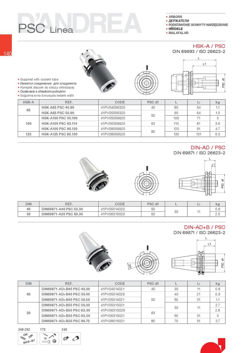 • ARBORS • ДЕРЖАТЕЛИ PSC Linea • PODSTAWOWE UCHWYTY NARZ}DZIOWE • H¢ DELE • MALAFALAR HSK-A / PSC 140 DIN 69893 / ISO 26623-2 • Supplied with coolant tube • Имеется соединение для хладагента •.RPSOHW]ŕĝF]HNGRFLHF]\FKŕRG]ĝFHM • 'RG¾YDQÆVFKODGLFÊPSRWUXEÊP •6RĽXWPDVIJYIJVIJERUXVX\ODWHGDULNHGLOLU HSK-A REF. CODE PSC d1 L L1 kg 63 HSK-A63 PSC 40.80 41PV04056320 40 80 54 1.1 HSK-A63 PSC 50.90 41PV05056320 50 90 64 1.5 HSK-A100 PSC 50.100 41PV05059920 100 71 3 100 HSK-A100 PSC 63.110 41PV06359920 63 110 81 3.6 HSK-A100 PSC 80.120 41PV08059920 80 120 91 4.7 125 HSK-A125 PSC 80.130 41PV08059520 130 101 6.5 DIN-AD / PSC DIN 69871 / ISO 26623-2 DIN REF. CODE PSC d1 L L1 kg 40 DIN69871-A40 PSC 50.30 41PV05014020 50 30 11 0.8 50 DIN69871-A50 PSC 63.30 41PV06315020 63 2.5 DIN-AD+B / PSC DIN 69871 / ISO 26623-2 DIN REF. CODE PSC d1 L L1 kg DIN69871-AD+B40 PSC 40.30 41PV04014021 40 30 11 0.8 40 DIN69871-AD+B40 PSC 50.40 41PV05014029 40 21 0.9 DIN69871-AD+B40 PSC 50.50 41PV05014021 50 50 31 1.1 DIN69871-AD+B50 PSC 50.30 41PV05015021 30 11 2.7 50 DIN69871-AD+B50 PSC 63.30 41PV06315029 63 2.8 DIN69871-AD+B50 PSC 63.50 41PV06315021 50 31 3 DIN69871-AD+B50 PSC 80.70 41PV08015021 80 70 51 3.7 249-252 173 240
