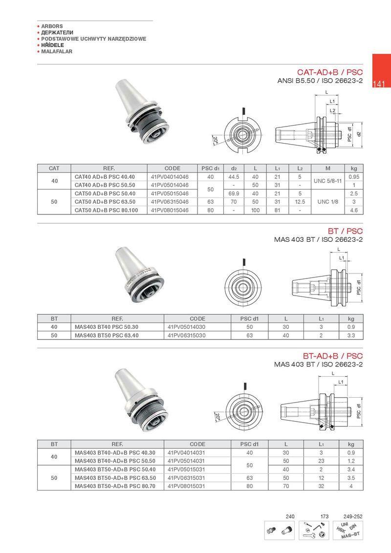 • ARBORS • ДЕРЖАТЕЛИ • PODSTAWOWE UCHWYTY NARZ}DZIOWE • H¢ DELE • MALAFALAR CAT-AD+B / PSC ANSI B5.50 / ISO 26623-2 141 CAT REF. CODE PSC d1 d2 L L1 L2 M kg 40 CAT40 AD+B PSC 40.40 41PV04014046 40 44.5 40 21 5 UNC 5/8-11 0.95 CAT40 AD+B PSC 50.50 41PV05014046 50 - 50 31 - 1 CAT50 AD+B PSC 50.40 41PV05015046 69.9 40 21 5 2.5 50 CAT50 AD+B PSC 63.50 41PV06315046 63 70 50 31 12.5 UNC 1/8 3 CAT50 AD+B PSC 80.100 41PV08015046 80 - 100 81 - 4.6 BT / PSC MAS 403 BT / ISO 26623-2 BT REF. CODE PSC d1 L L1 kg 40 MAS403 BT40 PSC 50.30 41PV05014030 50 30 3 0.9 50 MAS403 BT50 PSC 63.40 41PV06315030 63 40 2 3.3 BT-AD+B / PSC MAS 403 BT / ISO 26623-2 BT REF. CODE PSC d1 L L1 kg 40 MAS403 BT40-AD+B PSC 40.30 41PV04014031 40 30 3 0.9 MAS403 BT40-AD+B PSC 50.50 41PV05014031 50 50 23 1.2 MAS403 BT50-AD+B PSC 50.40 41PV05015031 40 2 3.4 50 MAS403 BT50-AD+B PSC 63.50 41PV06315031 63 50 12 3.5 MAS403 BT50-AD+B PSC 80.70 41PV08015031 80 70 32 4 240 173 249-252