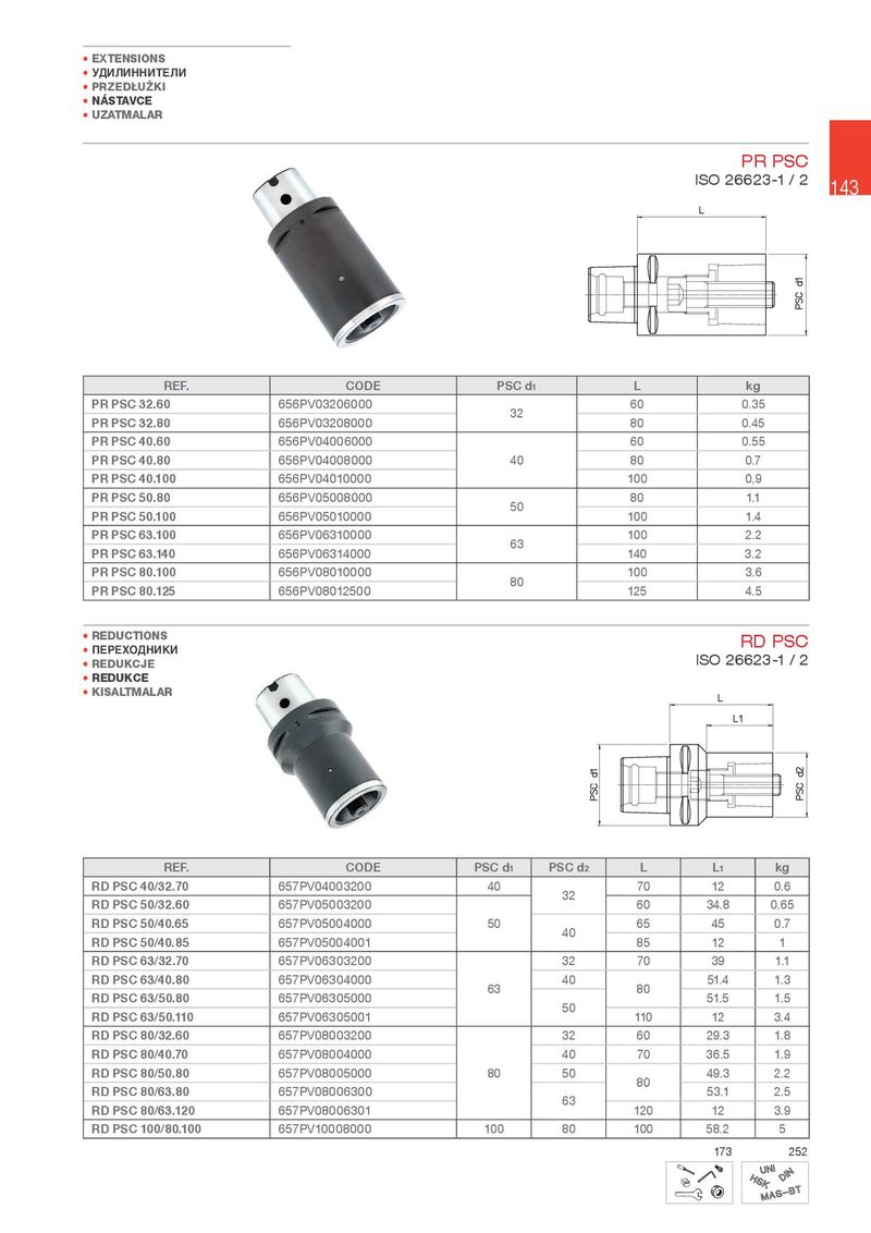 • EXTENSIONS • УДИЛИННИТЕЛИ • PRZEDU¾.I • NÁSTAVCE • UZATMALAR PR PSC ISO 26623-1 / 2 143 REF. CODE PSC d1 L kg PR PSC 32.60 656PV03206000 32 60 0.35 PR PSC 32.80 656PV03208000 80 0.45 PR PSC 40.60 656PV04006000 60 0.55 PR PSC 40.80 656PV04008000 40 80 0.7 PR PSC 40.100 656PV04010000 100 0,9 PR PSC 50.80 656PV05008000 50 80 1.1 PR PSC 50.100 656PV05010000 100 1.4 PR PSC 63.100 656PV06310000 63 100 2.2 PR PSC 63.140 656PV06314000 140 3.2 PR PSC 80.100 656PV08010000 80 100 3.6 PR PSC 80.125 656PV08012500 125 4.5 • REDUCTIONS RD PSC • ПЕРЕХОДНИКИ ISO 26623-1 / 2 • REDU.CJE • REDU.CE • .ISALTMALAR REF. CODE PSC d1 PSC d2 L L1 kg RD PSC 40/32.70 657PV04003200 40 32 70 12 0.6 RD PSC 50/32.60 657PV05003200 60 34.8 0.65 RD PSC 50/40.65 657PV05004000 50 40 65 45 0.7 RD PSC 50/40.85 657PV05004001 85 12 1 RD PSC 63/32.70 657PV06303200 32 70 39 1.1 RD PSC 63/40.80 657PV06304000 63 40 80 51.4 1.3 RD PSC 63/50.80 657PV06305000 50 51.5 1.5 RD PSC 63/50.110 657PV06305001 110 12 3.4 RD PSC 80/32.60 657PV08003200 32 60 29.3 1.8 RD PSC 80/40.70 657PV08004000 40 70 36.5 1.9 RD PSC 80/50.80 657PV08005000 80 50 80 49.3 2.2 RD PSC 80/63.80 657PV08006300 63 53.1 2.5 RD PSC 80/63.120 657PV08006301 120 12 3.9 RD PSC 100/80.100 657PV10008000 100 80 100 58.2 5 173 252