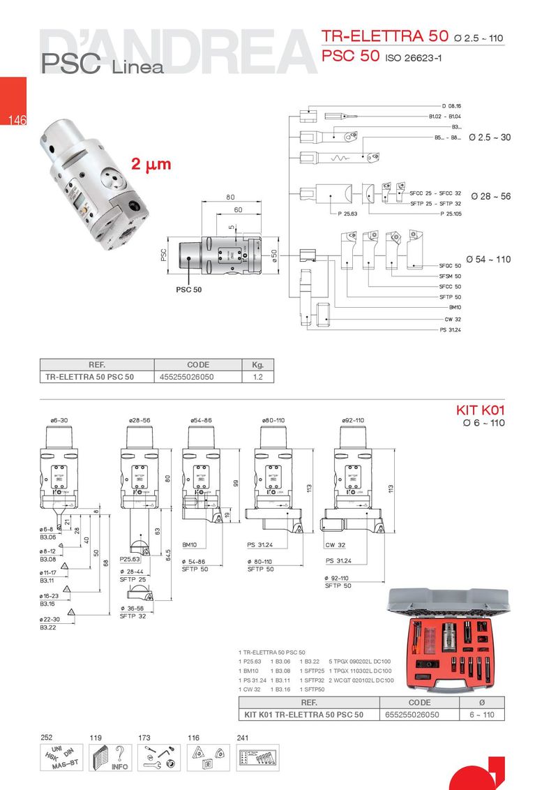 TR-ELETTRA 50 Ø 2.5 ~ 110 PSC Linea PSC 50 ISO 26623-1 146 Ø 2.5 ~ 30 2 m Ø 28 ~ 56 Ø 54 ~ 110 PSC 50 REF. CODE Kg. TR-ELETTRA 50 PSC 50 455255026050 1.2 KIT K01 Ø 6 ~ 110 1 TR-(/(775$ 50 PSC 50 1 P25.63 1 B3.06 1 B3.22 73*;/'& 1 BM10 1 B3.08 6)73 73*;/'& 1 PS 31.24 1 B3.11 6)73 :&*7/'& 1 CW 32 1 B3.16 6)73 REF. CODE Ø KIT K01 TR-ELETTRA 50 PSC 50 655255026050 6 ~ 110 252 119 173 116 241