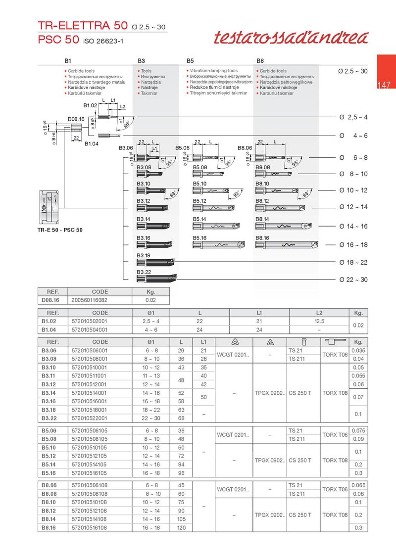 TR-ELETTRA 50 Ø 2.5 ~ 30 PSC 50 ISO 26623-1 B1 B3 B5 B8 •&DUELGHWRROV • Tools •9LEUDWLRQGDPSLQJWRROV •&DUELGHWRROV Ø 2.5 ~ 30 • Твердосплавные инструменты • Инструменты • Виброизоляционные инструменты • Твердосплавные инструменты •1DU]ĸG]LD]WZDUGHJRPHWDOX •1DU]ĸG]LD • 1DU]ĸG]LD]DSRELHJDMĝFHZLEUDFMRP •1DU]ĸG]LDSHŕQRZĸJOLNRZH 147 •.DUELGRYÆQ¾VWURMH •1¾VWURMH •5HGXNFHWOXPÊFÊQ¾VWURMH •.DUELGRYÆQ¾VWURMH •.DUEÙUOÙWDNIJPODU •7DNIJPODU •7LWUHūLPVÓQÙPOH\LFLWDNIJPODU •.DUEÙUOÙWDNIJPODU / / B1.02 / 16 J D08.16 Ø 8 J Ø1 Ø 2,5 ~ 4 96° Ø H6 Ø 4~6 8 22 22 / 22 / 22 / Ø B1.04 B3.06 / B5.06 B8.06 J J J Ø 6~8 16 Ø1 95° 16 Ø1 95° 16 Ø1 95° Ø B3.08 Ø B5.08 Ø B8.08 Ø 8 ~ 10 B3.10 B5.10 B8.10 93° 93° 93° Ø 10 ~ 12 B3.12 B5.12 B8.12 Ø 12 ~ 14 B3.14 B5.14 B8.14 TR-E 50 - PSC 50 Ø 14 ~ 16 B3.16 B5.16 B8.16 Ø 16 ~ 18 B3.18 Ø 18 ~ 22 B3.22 Ø 22 ~ 30 REF. CODE Kg. D08.16 200560116082 0.02 REF. CODE Ø1 L L1 L2 Kg. B1.02 572010502001 2.5 ~ 4 22 21 12.5 0.02 B1.04 572010504001 4~6 24 24 – REF. CODE Ø1 L L1 Kg. B3.06 572010506001 6~8 29 21 WCGT 0201.. – TS 21 TORX T06 0.035 B3.08 572010508001 8 ~ 10 36 28 TS 211 0.04 B3.10 572010510001 10 ~ 12 43 35 0.05 B3.11 572010511001 11 ~ 13 48 40 0.055 B3.12 572010512001 12 ~ 14 42 0.06 B3.14 572010514001 14 ~ 16 52 50 – TPGX 0902.. CS 250 T TORX T08 0.07 B3.16 572010516001 16 ~ 18 58 B3.18 572010518001 18 ~ 22 63 – 0.1 B3.22 572010522001 22 ~ 30 68 B5.06 572010506105 6~8 36 WCGT 0201.. – TS 21 TORX T06 0.075 B5.08 572010508105 8 ~ 10 48 TS 211 0.09 B5.10 572010510105 10 ~ 12 60 – 0.1 B5.12 572010512105 12 ~ 14 72 – TPGX 0902.. CS 250 T TORX T08 B5.14 572010514105 14 ~ 16 84 0.2 B5.16 572010516105 16 ~ 18 96 0.3 B8.06 572010506108 6~8 45 WCGT 0201.. – TS 21 TORX T06 0.065 B8.08 572010508108 8 ~ 10 60 TS 211 0.08 B8.10 572010510108 10 ~ 12 75 – 0.1 5N72E0W1051F2O10T8 O .IT B8.12 12 ~ 14 90 – TPGX 0902.. CS 250 T TORX T08 0.2 B8.14 572010514108 14 ~ 16 105 B8.16 572010516108 16 ~ 18 120 0.3