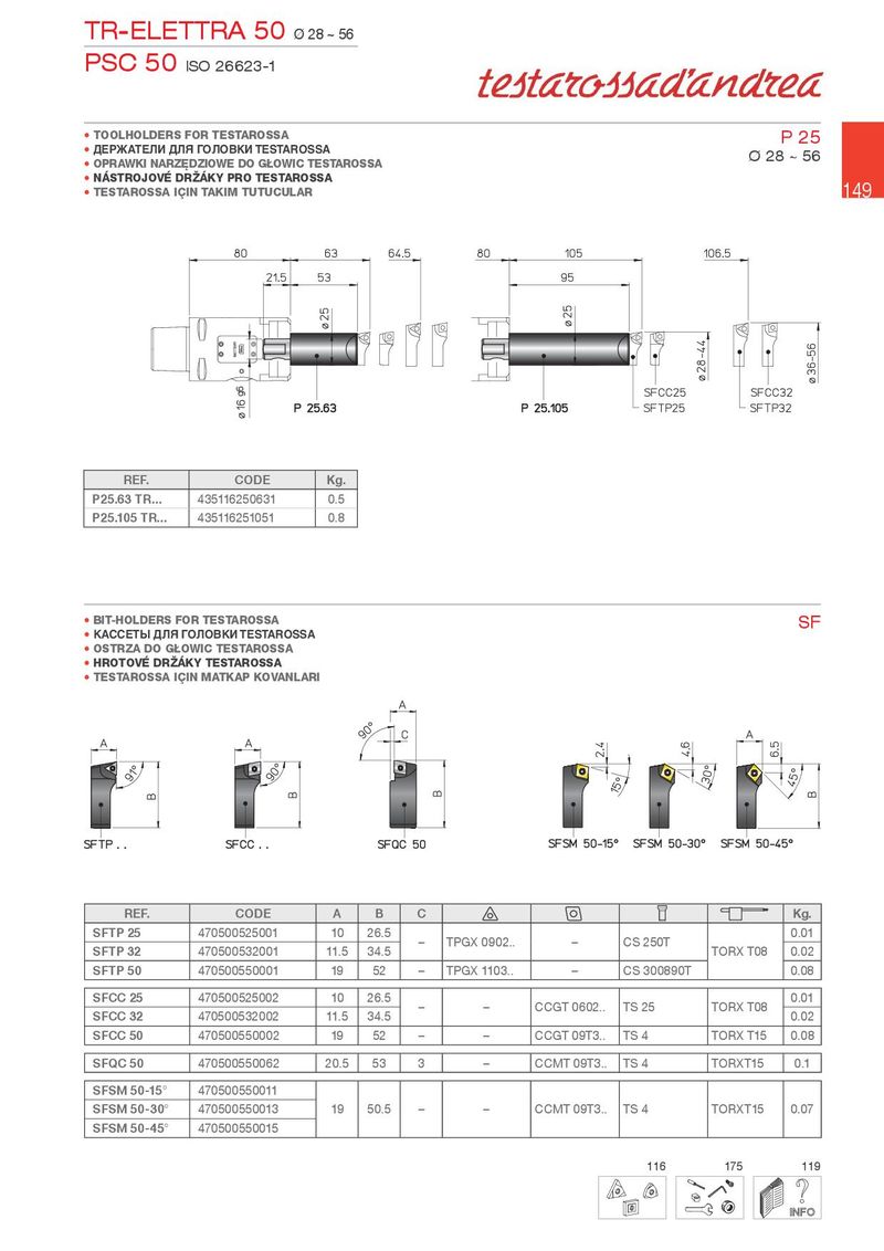 TR-ELETTRA 50 Ø 28 ~ 56 PSC 50 ISO 26623-1 • TOOLHOLDERS FOR TESTAROSSA P 25 • ДЕРЖАТЕЛИ ДЛЯ ГОЛОВКИ TESTAROSSA Ø 28 ~ 56 • OPRAW.I NARZ}DZIOWE DO GOWIC TESTAROSSA • NÁSTROJOVÉ DR½Á.Y PRO TESTAROSSA 149 • TESTAROSSA IqIN TA.IM TUTUCULAR REF. CODE Kg. P25.63 TR... 435116250631 0.5 P25.105 TR... 435116251051 0.8 • BIT-HOLDERS FOR TESTAROSSA SF • КАССЕТЫ ДЛЯ ГОЛОВКИ TESTAROSSA • OSTRZA DO GOWIC TESTAROSSA • HROTOVÉ DR½Á.Y TESTAROSSA • TESTAROSSA IqIN MAT.AP .OVANLARI REF. CODE A B C Kg. SFTP 25 470500525001 10 26.5 – TPGX 0902.. – CS 250T 0.01 SFTP 32 470500532001 11.5 34.5 TORX T08 0.02 SFTP 50 470500550001 19 52 – TPGX 1103.. – CS 300890T 0.08 SFCC 25 470500525002 10 26.5 – – CCGT 0602.. TS 25 TORX T08 0.01 SFCC 32 470500532002 11.5 34.5 0.02 SFCC 50 470500550002 19 52 – – CCGT 09T3.. TS 4 TORX T15 0.08 SFQC 50 470500550062 20.5 53 3 – CCMT 09T3.. TS 4 TORXT15 0.1 SFSM 50-15° 470500550011 SFSM 50-30° 470500550013 19 50.5 – – CCMT 09T3.. TS 4 TORXT15 0.07 SFSM 50-45° 470500550015 116 175 119