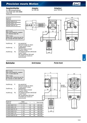 70 9570 Precision meets Motion Ausgleichhalter Adaptor Adapteur für Werkzeugaufnahmen for VDI 20 pour VDI 20 mit Schaft nach DIN 69880 ø 20 x 40 2 Bestell Nr 60 Order No. WA2520 G200 R (V) 20 WA2520 G200 L (V) WA2520 G200 RL (V) Mit V-Leiste, 30 35 bitte hinter Bestell-Nr. angeben, z.B. WA2520 G200 RV With V-plate, please add V behind the part No. for example WA 2520 G200 RV Ausführung R wie gezeichnet right hand design as shown à droite suivant croquis Ausführung L spiegelbildlich left hand design reversed à gauche inversé Ausführung RL mit doppelverzahntem DIN-Schaft(Lizenz Traub) ø25 with doubletoothed DIN shaft universelle pour broche et contre-broche 4 Bohrhalter Drill Holder Porte-foret Mit V-Leiste, bitte hinter Bestell-Nr. angeben, l z.B. 31.2525 G200 RV 60 With V-plate, l please add V behind the part No. for example 31.2525 G200 RV Ausführung R wie gezeichnet right hand design as shownà droite suivant croquis RD/ER25 430 E Ausführung L spiegelbildlich left hand design reversed 30 30 à gauche inversé Ausführung RL mit doppelverzahntem DIN-Schaft (Lizenz Traub) with doubletoothed DIN shaft universelle pour broche et contre-broche Bestell NrOrder No. Maßed2 Spannbereichl1 l2 Spannzange 31.2525 G200 R (V) 1 - 16 30 60 250 430E 31.2525 G200 L (V) 1 - 16 30 60 250 430E 31.2525 G200 RL (V) 1 - 16 30 60 250 430E 31.2540 G200 R (V) 3 - 26 55 85 400 472E ø25 31.2540 G200 L (V) 3 - 26 55 85 400 472E 31.2540 G200 RL (V) 3 - 26 55 85 400 472E 4.61