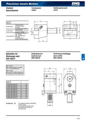 29 20 ø2570 95 66 Precision meets Motion Vierkant Turning tool Radial porte-outil Queraufnahme radial carré 61 60 Bestell NrOrder No. 30 wie gezeichnet 5.2520 G200 right hand designas shown à droite suivant croquis spiegelbildlich 6.2520 G200 left hand design reversed à gauche inversé mit doppelverzahntem DIN - Schaft 5.2520 G200 RL with doubletoothedDIN shaft universelle pour broche et contre-broche 40 Bohrhalter für Drillholder for Porte barre dalésage Werkzeuge nach tools to suit pour outils DIN 1835 E DIN 1835 E DIN 1835 E 4 Mit V-Leiste, bitte hinter Bestell-Nr. angeben, z.B. 27.2506 G2WN RV 60 60 With V-plate, l1 d1 please add V behind the part No. for example 27.2506 G2WN RV Bestell NrOrder No. d1 l1 27.2506 WN G200 RL 6 36 27.2508 WN G200 RL 8 36 27.2510 WN G200 RL 10 40 27.2512 WN G200 RL 12 45 27.2514 WN G200 RL 14 45 27.2516 WN G200 RL 16 48 27.2518 WN G200 RL 18 48 27.2520 WN G200 RL 20 50 27.2525 WN G200 RL 25 54 Ausführung RL mit doppelverzahntem DIN-Schaft (Lizenz Traub) ø25 with doubletoothed DIN shaft universelle pour broche et contre-broche 4.67