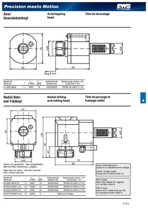 64 70102 62 ø3527 ø25ø25 Precision meets Motion Axial Axial tapping Tête de taraudage Gewindebohrkopf head 62 79 Zug 8 mm Bestell NrOrder No. i [1n/mmaixn] [TNmmax] Schlüsselsatz Spannzange (siehe 1.27)Wrench-setCollet (see 1.27) 41.2520 G200 1:1 6000 16 GS30/GS22 RD/ER 20 428 E (1-13) Radial Bohr- Radial drilling Tête de perçage et und Fräskopf and milling head fraisage radial 4 64 ø35 70 Rechts wie gezeichnet - links spiegelbildlich 96 Innere Kühlmittelzufuhr: Bitte bei linker Ausführung L angeben. Zusatz IK an Bestellnummer anfügen. Right hand as shown - left hand reversed Central cooling supply: add L behind order No. Please add IK behind order no. Bestell NrOrder No. i [1n/mmaixn] [TNmmax] Schlüsselsatz Spannzange (siehe 1.27)Wrench-setCollet (see 1.27)Mit V-Leiste, 60.2520 G200 (V) 1:1 6000 16 GS30/HS40 RD/ER 20 428 E (1-13) bitte hinter Bestell-Nr. angeben,z.B. 60.2520 G200 V 60.2520 G200/1 (V) 1:2 12000 16 GS30/HS40 RD/ER 20 428 E (1-13) With V-plate, 60.2520 G200/2 (V) 2:1 6000 32 GS30/HS40 RD/ER 20 428 E (1-13) please add V behind the part No. 60.2516 G200/15 (V) 1:5 20000 5 Maße auf Anfrage for example 60.2520 G200 V 4.70.3