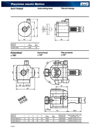64 70 84 42 ø25 ø25 Precision meets Motion Axial Fräskopf Axial milling head Tête de fraisage 62 66 Bestell NrOrder No. i [1n/mmaixn] [TNmmax] 42.2500 G200 1:1 5000 25 Schwenkkopf Swivel head Tête pivotante ± 105° ± 105° ± 105° 105° 105° 32 28,5 X1 81 N iE=W1S: 2 X2 X3 58,5 Bestell NrOrder No. i d X1 X2 X3 nmax[1/min] Tmax[Nm] Schlüsselsatz Spannzange (siehe 1.27)Wrench-setCollet (see 1.27) 63.2516 G200/1(V) 1:2 32 53 25 102 10000 18 GS25/HS25 RD/ER 16 426 E (1-10) 63.2520 G200 (V) 1:1 35 58 26 115 10000 16 GS30/HS35 RD/ER 20 428 E (1-13) 4.70.6