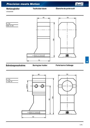 ø32H7 85 108108 Precision meets Motion Werkzeughalter Toolholder blank Ébanche de porte-outil vorbearbeitet 40 54 Nr. / No. RABC 75.108 72 4 Bohrstangenaufnahme Boring bar holder Porte barre dalésage 40 54 Nr. / No. 19. ABC 32 72 4.75