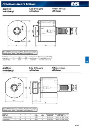 70 70ød ø37 ø25h6ø25h6 Precision meets Motion Axial Bohr- Axial drilling and Tête de perçage und Fräskopf milling head et fraisage 62 66 Innere Kühlmittelzufuhr. Zusatz IK an Bestellnummer anfügen. Central cooling supply. Please add IK behind order no. Bestell Nr.Order No.i nmax Tmax Schlüsselsatz Spannzange (siehe 1.27)[1/min][Nm]Wrench-setCollet (see 1.27) 40.2520 ABC 1:1 6000 16 LS20/HS40 RD/ER 20 428E (1-13) 4 Axial Bohr- Axial drilling and Tête de perçage und Fräskopf milling head et fraisage 62 x1 x Innere Kühlmittelzufuhr. Zusatz IK an Bestellnummer anfügen. Central cooling supply. Please add IK behind order no. Bestell Nr.Order No. i d x x1 [1n/mmaixn] [TNmmax] Schlüsselsatz Spannzange (siehe 1.27)Wrench-setCollet (see 1.27) 40.2520 ABC AM 1:1 35 78 27 6000 16 220/HS40 RD/ER 20 428E (1-13) 40.2525 ABC 1:1 42 79 28 6000 16 225/HS40 RD/ER 25 430E (2-15) 4.79.1