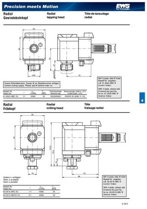 64 64 76115,5 2775,5 19 ø25h6 ø25h6 Precision meets Motion Radial Radial Tête de taraudage Gewindebohrkopf tapping head radial 64 ø35 70 Mit V-Leiste, bitte V hinter Bestell-Nr. angeben, Innere Kühlmittelzufuhr. Zusatz IK an Bestellnummer anfügen. z.B. 61.2520 ABC V Central cooling supply. Please add IK behind order no. (Lizenz Index) With V-plate, please add Bestell Nr.Order No. i [1n/mmaixn] [TNmmax] Schlüsselsatz Spannzange (siehe 1.27)Wrench-setCollet (see 1.27)V behind the part No.for ex. 61.2520 ABC V 61.2520 ABC (V) 1:1 6000 16 GS30/GS22 RD/ER 25 428E (1-13) (licence Index) 4 Radial Radial Tête Fräskopf milling head fraisage radial 64 16 70 Andere ø verfügbar 96 Mit V-Leiste, bitte V hinter Other ø available Bestell-Nr. angeben, Autre ø possible z.B. 62.2516 ABC V (Lizenz Index) Bestell Nr.Order No. i [1n/mmaixn] [TNmmax] With V-plate, please addV behind the part No. 62.2516 ABC (V) 1:1 6000 25 for ex. 62.2516 ABC V 62.2516 ABC/2 (V) 2:1 6000 40 (licence Index) 4.79.5