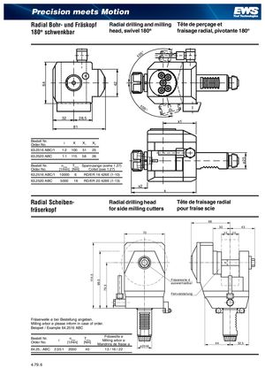 64 114,5 99,5 79,5 42 d ø25 Precision meets Motion Radial Bohr- und Fräskopf Radial drilling and milling Tête de perçage et 180° schwenkbar head, swivel 180° fraisage radial, pivotante 180° 105° 105° 32 28,5 x1 81 Bestell Nr.Order No. i X X1 X2 63.2516 ABC/1 1:2 100 51 25 63.2520 ABC 1:1 115 58 26 Bestell Nr.Order No.[1n/mmaixn][TNmmax]Spannzange (siehe 1.27)Collet (see 1.27) 63.2516 ABC/1 10000 6 RD/ER 16 426E (1-10) 63.2520 ABC 5000 16 RD/ER 20 428E (1-13) x2 x Radial Scheiben- Radial drilling head Tête de fraisage radial fräserkopf for side milling cutters pour fraise scie 68 30 43 70 15 15 Fräserwelle d auswechselbar Feinverstellung Fräserwelle ø bei Bestellung angeben. Milling arbor ø please inform in case of order. Beispiel / Example 64.2516 ABC Bestell Nr.Order No.i nmax[1/min] Tmax[Nm] Fräswelle øMilling arbor øMandrins de fraise øø25h6 44 32,5 64.25.. ABC 2,55:1 2000 40 13 / 16 / 22 4.79. 6