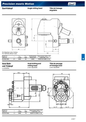 115 30 64 52,5 32,5 30 R28 ø25h6 Precision meets Motion Querfräskopf Angle milling head Tête de fraisage angulaire 68 30 75 Für Maschinen ohne Y-Achse For machines without Y-axis 109 Bestell Nr.Order No. i nmax Tmax Schlüsselsatz Spannzange (siehe 1.27)[1/min][Nm]Wrench-setCollet (see 1.27) 65.2520 ABC 2:1 6000 32 LS20/ RD/ER 20 428E (1-13) 4 Axial Bohr- Axial drilling and Tête de perçage und Fräskopf milling head et fraisage axial y-verstellbar y-axis adjustable y-axis adjustable 39,5 21 64 8,5 78 ca. 47 ca. 47 Bestell Nr.Order No. i nmax Tmax Spannzange (siehe 1.27)[1/min][Nm]Collet (see 1.27) 56.2516 ABC 1:1 6000 16 RD/ER 16 426E (1-10) 4.79.7