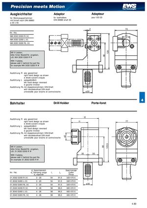 d2 9090 120123,5 Precision meets Motion Ausgleichhalter Adaptor Adapteur für Werkzeugaufnahmen for toolholders pour VDI 20 mit Schaft nach DIN 69880 DIN 69880 shaft 30 ø 30 x 55 2 70 Nr. / No. WA 3030 G300 R (V) 30 WA 3030 G300 L (V) WA 3030 G300 RL (V) Mit V-Leisten, bitte hinter Bestell-Nr. angeben, z.B. WA 3030 G300 R V With V-plates, please add V behind the part No. for example WA 3030 G300 R V Ausführung R wie gezeichnet right hand design as shown à droite suivant croquis Ausführung L spiegelbildlich left hand design reversed à gauche inversé Ausführung RL mit doppelverzahntem DIN-Shaft with doubletoothed DIN shaft universelle pour broche et contre-broche ø30 4 Bohrhalter Drill Holder Porte-foret l2 Ausführung R wie gezeichnet right hand design as shown l1 77 à droite suivant croquis Ausführung L spiegelbildlich left hand design reversed à gauche inversé Ausführung RL mit doppelverzahntem DIN-Shaft with doubletoothed DIN shaft universelle pour broche et contre-broche Mit V-Leisten, bitte hinter Bestell-Nr. angeben, z.B. 31.3032 G300 R V With V-plates, 35 35 please add V behind the part No. for example 31.3032 G300 R V d2 Spannbereich Spannzange Nr. / No. d2 clamping range l1 l2 Collet d2 capacité Pince 31.3032 G300 R (V) 3 - 20 54 91,5 320 470 E 31.3032 G300 L (V) 3 - 20 54 91,5 320 470 E 31.3032 G300 RL (V) 3 - 20 54 91,5 320 470 E ø30 31.3040 G300 R (V) 4 - 26 58 95,5 400 472 E 31.3040 G300 L (V) 4 - 26 58 95,5 400 472 E 31.3040 G300 RL (V) 4 - 26 58 95,5 400 472 E 4.801