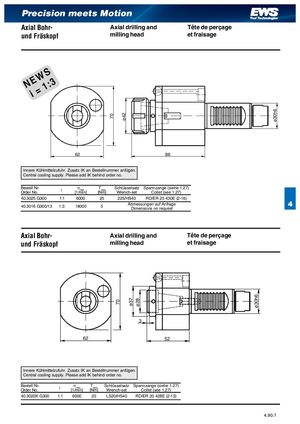 70 70 ø42 ø37 ø28 ø30h6 ø30h6 Precision meets Motion Axial Bohr- Axial drilling and Tête de perçage und Fräskopf milling head et fraisage N iE=W1S: 3 62 86 Innere Kühlmittelzufuhr. Zusatz IK an Bestellnummer anfügen. Central cooling supply. Please add IK behind order no. Bestell Nr.Order No. i [1n/mmaixn] [TNmmax] Schlüsselsatz Spannzange (siehe 1.27)Wrench-setCollet (see 1.27) 40.3025 G300 1:1 6000 25 225/HS40 RD/ER 25 430E (2-16) 40.3016 G300/13 1:3 18000 5 Abmessungen auf AnfrageDimensions on request 4 Axial Bohr- Axial drilling and Tête de perçage und Fräskopf milling head et fraisage 3 62 52 Innere Kühlmittelzufuhr. Zusatz IK an Bestellnummer anfügen. Central cooling supply. Please add IK behind order no. Bestell Nr.Order No. i nmax Tmax Schlüsselsatz Spannzange (siehe 1.27)[1/min][Nm]Wrench-setCollet (see 1.27) 40.3020K G300 1:1 6000 20 LS20/HS40 RD/ER 20 428E (2-13) 4.90.1