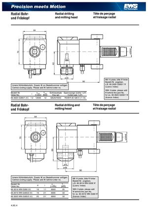 70 70 6269 ø30h6 ø30h6 Precision meets Motion Radial Bohr- Radial drilling Tête de perçage und Fräskopf and milling head et fraisage radial 64 ø35 Mit V-Leiste, bitte V hinter 90 Bestell-Nr. angeben, Innere Kühlmittelzufuhr. Zusatz IK an Bestellnummer anfügen.Central cooling supply. Please add IK behind order no.z.B. 60.3020 G300/1 V(Lizenz Index) With V-plate, please add Bestell Nr.Order No. i nmax Tmax Schlüsselsatz Spannzange (siehe 1.27)[1/min][Nm]Key-setCollet (see 1.27)V behind the part No.for ex. 60.3020 G300/1 V 60.3020 G300/1 (V) 1:2 12000 12 GS25/HS40 RD/ER 20 428 E (1-13) (licence Index) Radial Bohr- Radial drilling and Tête de perçage und Fräskopf milling head et fraisage radial 64 ød ø48 90 Innere Kühlmittelzufuhr. Zusatz IK an Bestellnummer anfügen.Central cooling supply. Please add IK behind order no.Mit V-Leiste, bitte V hinterBestell-Nr. angeben, Bestell Nr.Order No. d i nmax[1/min] Tmax[Nm] z.B. 60.3016 WN G300 V(Lizenz Index) 60.3016 WN G300 (V) 16 1:1 6000 25 With V-plate, please add 60.3016 WN G300/2 (V) 16 2:1 6000 32 V behind the part No.for ex. 60.3016 WN G300 V 60.3020 WN G300/2 (V) 20 2:1 6000 32 (licence Index) 4.90. 4