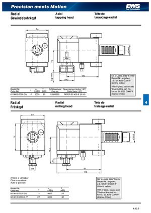 70 73,5 7617 ø30h6 ø30h6 Precision meets Motion Radial Axial Tête de Gewindebohrkopf tapping head taraudage radial 64 90 Mit V-Leiste, bitte V hinter ø42 Bestell-Nr. angeben,z.B. 61.3025 G300 V (Lizenz Index) With V-plate, please add Bestell Nr.Order No. i [1n/mmaixn] [TNmmax] Schlüsselsatz Spannzange (siehe 1.27)Key-setCollet (see 1.27) V behind the part No.for ex. 61.3025 G300 V 61.3025 G300 (V) 1:1 6000 25 225/GS22 RD/ER 25 430 E (2-16) (licence Index) Radial Radial Tête de 4 Fräskopf milling head fraisage radial 64 ø16 91 116 Andere ø verfügbarOther ø availableAutre ø possible Mit V-Leiste, bitte V hinterBestell-Nr. angeben,z.B. 62.3016 G300 V (Lizenz Index) Bestell Nr.Order No. i [1n/mmaixn] [TNmmax] With V-plate, please add 62.3016 G300 (V) 1:1 6000 25 V behind the part No.for ex. 62.3016 G300 V 62.3016 G300/2 (V) 2:1 6000 32 (licence Index) 4.90.5