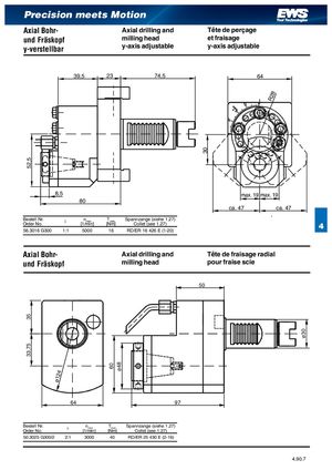 52,53533,75 ø124 60 ø48 30 R28 ø30 Precision meets Motion Axial Bohr- Axial drilling and Tête de perçage und Fräskopf milling head et fraisage y-verstellbar y-axis adjustable y-axis adjustable 39,5 23 74,5 64 8,5 80 ca. 47 ca. 47 Bestell Nr.Order No. i nmax Tmax Spannzange (siehe 1.27)[1/min][Nm]Collet (see 1.27) 4 56.3016 G300 1:1 5000 16 RD/ER 16 426 E (1-20) Axial Bohr- Axial drilling and Tête de fraisage radial und Fräskopf milling head pour fraise scie 50 64 97 Bestell Nr.Order No. i [1n/mmaixn] [TNmmax] Spannzange (siehe 1.27)Collet (see 1.27) 50.3025 G300/2 2:1 3000 40 RD/ER 25 430 E (2-16) 4.90.7