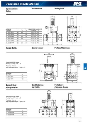 100d 83 M1241 75 99,5 d75 75 105 Precision meets Motion Spannzangen- Collet chuck Porte pince halter ø25 60 Bestell NrOrder No. d L1 L2 Spannzange (siehe 1.27)Collet (see 1.27) 31.2525 MFT L 42 60 --- RD/ER 25 430E 31.2525 MFT R 42 --- 60 RD/ER 25 430E 31.2525D MFT 42 60 60 RD/ER 25 430E 31.2532 MFT L 50 64 --- RD/ER 32 470E 31.2532 MFT R 50 --- 64 RD/ER 32 470E 31.2532D MFT 50 64 64 RD/ER 32 470E L1 L2 Kombi-Halter Combi holder Porte outil combiné 60 ø25 Reduzierbuchsen siehe Katalog Rubrik 1, Seite 1.20 Reducing sleeves see Catalogue chapter 1, page 1.20 5 Bestell NrOrder No. d 17.2525 MFT 25 17.2532 MFT 32 60 Doppel Bohr- Double boring Porte barré stangenhalter bar holder dalesage double ø25 Reduzierbuchsen siehe Katalog Rubrik 1, Seite 1.20 Reducing sleeves see Catalogue chapter 1, page 1.20 Bestell NrOrder No. d 17.2525D MFT 25 17.2532D MFT 32 99 54 5.110