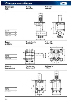 89 80,5 ø2572 ød 1616 104 75 60 Precision meets Motion Bohrstangen- Boring Porte barré halter bar holder dalésage ø25 Bestell NrOrder No. d 19.2525 MFT 25 19.2532 MFT 32 60 Doppel- Double turning Porte outil drehhalter toolholder double coté 66 Bestell Nr Order No. 15.2516 E332 48 19 19 Vierkant- Turning tool- Radial porte Queraufnahme holder radial outil carré ø25 Bestell Nr Order No. 5.2516 E332 16 16 60 60 5. 112