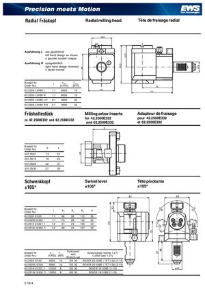 ød 64 X3 X2 93,5 53,5 X1 57 48 ø25 Precision meets Motion RRadaidailaBl oFhrär-skopfund Fräskopf RmRaildaliidnaigladlhrmeilaillidlninggahnedad eTtêTftêreatedisedaepgeferrarçaiasdgaieagle radial ø50 Ausführung L wie gezeichnet left hand design as shown à gauche suivant croquis Ausführung R spiegelbildlich right hand design reversed à droite inversé Bestell NrOrder No. i [1n/mmaixn] [TNmmax] 75 62.2500 L5480 L 1:1 6000 16 64 101 62.2500 L5480 R 1:1 6000 16 62.2500 L5480 L/2 2:1 3000 32 62.2500 L5480 R/2 2:1 3000 32 Fräshaltestück Milling arbor inserts Adapteur de fraisage zu 42.2500E332 und 62.2500E332 for 42.2500E332and 62.2500E332 pour 42.2500E332et62.2500E332 X Bestell NrOrder No.d x 501.0507 13 24 501.0510 16 29 501.0520 22 31 501.0530 27 33 Schwenkkopf Swivel level Tête pivotante ±105° ±105° ±105° 81 64 Bestell NrOrder No. i X1 X2 X3 d 105° 105° 63.2520 E332 1:1 58 26 115 35 63.2520L E332 1:1 75 26 132 35 63.2516 E332 / 1 1:2 51 25 100 32 63.2516L E332 /1 1:2 68 25 127 32 Bestell NrOrder No. nmax Tmax[1/min][Nm]Schlüssel-satzWrench-setSpannzange (siehe 1.27)Collet (see 1.27) 63.2520 E332 6000 16 GS 30 RD/ER 20 428E / *ET1-20 (2-13) 63.2520L E332 6000 16 GS 30 RD/ER 20 428E / *ET1-20 (2-13) 63.2516 E332 / 1 12000 8 GS 30 RD/ER 16 426E (1-10) ø25 63.2516L E332 /1 12000 8 GS 30 RD/ER 16 426E (1-10) 5.16.4