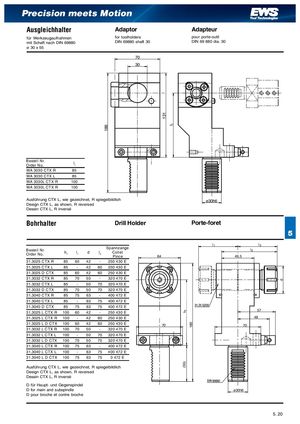186 131 l h(55) 180 d Precision meets Motion Ausgleichhalter Adaptor Adapteur für Werkzeugaufnahmen for toolholders pour porte-outil mit Schaft nach DIN 69880 DIN 69880 shaft 30 DIN 69 880 dia. 30 ø 30 x 55 70 30 Bestell Nr.Order No. l1 WA 3030 CTX R 85 WA 3030 CTX L 85 WA 3030L CTX R 100 WA 3030L CTX R 100 Ausführung CTX L, wie gezeichnet, R spiegelbildlich ø30h6 Design CTX L, as shown, R reversed Dessin CTX L, R inversé Bohrhalter Drill Holder Porte-foret 5 Bestell Nr.Order No. Spannzangeh1l1dl3ColletPince 64 l l!l49,5 31.3025 CTX R 85 60 42 - 250 430 E 31.3025 CTX L 85 - 42 60 250 430 E 31.3025 D CTX 85 60 42 60 250 430 E 31.3032 CTX R 85 70 50 - 320 470 E 31.3032 CTX L 85 - 50 70 320 470 E 31.3032 D CTX 85 70 50 70 320 470 E 31.3040 CTX R 85 75 63 - 400 472 E 31.3040 CTX L 85 - 63 75 400 472 E 31.3040 D CTX 85 75 63 75 400 472 E 31.3025 L CTX R 100 60 42 - 250 430 E 57 31.3025 L CTX R 100 - 42 60 250 430 E 48 31.3025 L D CTX 100 60 42 60 250 430 E 70 70 31.3032 L CTX R 100 70 50 - 320 470 E 31.3032 L CTX L 100 - 50 70 320 470 E 31.3032 L D CTX 100 70 50 70 320 470 E 31.3040 L CTX R 100 75 63 - 400 472 E 31.3040 L CTX L 100 - 63 75 400 472 E 31.3040 L D CTX 100 75 63 75 0 472 E Ausführung CTX L, wie gezeichnet, R spiegelbildlich Design CTX L, as shown, R reversed Dessin CTX L, R inversé D für Haupt- und Gegenspindel D for main and subspindle ø30h6 D pour broche et contre broche 5. 120