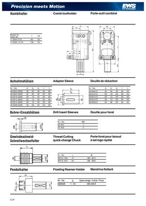 MKMd2 ø25 ø25 ø25 d3 d2 d1 180 l1(55) Precision meets Motion Kombihalter Combi toolholder Porte-outil combiné 70 64 35 d Bestell Nr.Order No. l1 ød 17.3025 CTX 85 25 17.3025 L CTX 100 25 57 48 70 ø30 Aufnahmehülsen Adaptor Sleeve Douille de réduction Nr. / No. d1 d2 d3 l1 l2 l1 Nr. / No. d1 d2 d3 l1 l2 28.3225 G200 32 25 40 63 58 l2 28.2520 S 25 20 29 50 46 28.3220 G200 32 20 40 63 58 28.2516 S 25 16 29 50 46 28.3216 G200 32 16 40 63 58 28.2512 S 25 12 29 50 46 28.3212 G200 32 12 40 63 58 28.2510 S 25 10 29 50 46 28.3210 G200 32 10 40 63 58 28.2508 S 25 08 29 50 46 28.3208 G200 32 08 40 63 58 Bohrer-Einsatzhülsen Drill Insert Sleeves Douille pour foret 10 Nr. / No. MK QT 831 1 QT 832 2 Gewindeschneid- Thread Cutting Porte foret pour taraud Schnellwechselfutter quick-change Chuck à serrage rapide l Nr. / No. l1 M WFLK 1/25 41 M3 - M12 WFLK 2/25 64 M8 - M20 Pendelhalter Floating Reamer Holder Mandrins flottant 50 Nr. / No. d2 Spannzange / Collet / Pince 0250025 1 - 16 250 430 E 5.21