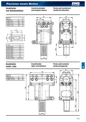 ø40 ød ø32 125 70 (55)d l1l1(55) 180 Precision meets Motion Kombihalter Combi toolholder Porte-outil combiné et und Aufnahmehülsen and Adaptor Sleeve douille de réduction 70 64 Bestell Nr.Order No. l1 ød 35 ød 17.3032 CTX 85 32 17.3040 CTX 85 40 17.3032 L CTX 100 32 17.3040 L CTX 100 40 63 58 Nr. / No. d 28.3206 G200 06 70 28.3208 G200 08 28.3210 G200 10 28.3212 G200 12 28.3216 G200 16 28.3220 G200 20 28.3225 G200 25 28.3225,4 G200 25,4 (1") ø30 Kombihalter Combiholder Porte-outil combiné rechts / links right- and lefthand droite and gauche 5 64 118 20,8 20,8 Bestell Nr.Order No. l1 ød 17.3032 D CTX 85 32 17.3032 L D CTX 100 32 ø30 5. 322