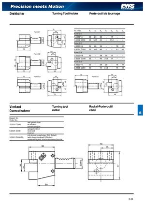 h5h6 34 25 ø30ø30ø30 h1 h1h1 h5h6h6h7 ø30h6 ø30 h6h7 h1 77 Precision meets Motion Drehhalter Turning Tool Holder Porte-outil de tournage 75Form C1b3 Nr. / No. h1 h5 h6 h7 b3 b4 b5 Form C1 1.3020/16 20 28 38 -- 17 -- -- 1.3025 G300 25 34,5 46 -- 17,2 -- -- Form C2 4.3020/16 20 28 38 -- -- 76 41 70 4.3025 G300 25 34,5 46 -- -- 81 46 b5 Form C3 Form C2 17 2.3020/16 20 -- 38 35 17 -- -- 2.3025 G300 25 -- 46 34,5 17 -- -- Form C4 3.3020/16 20 -- 38 35 -- 76 41 3.3025 G300 25 -- 46 34,5 -- 75 46 70 b4 70 b5 70 Form C3 b3 Form C4 17 70 b4 Vierkant Turning tool Radial-Porte-outil Queraufnahme radial carré 5 Bestell Nr. Order No. wie gezeichnet 5.3025 G300 as shown suivant croquis spiegelbildlich 6.3025 G300 reversed inversé mit doppelverzahntem DIN-Schaft 5.3025 G300 RL with doubletoothed DIN shaft universelle pour broche et contre-broche 70 86 35 60 5. 254