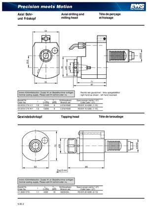 28,8 ø110 70 ø35 50 ø40 ø24 ø30h6 ø30h6 Precision meets Motion Axial Bohr- Axial drilling and Tête de perçage und Fräskopf milling head et fraisage 64 55 71 80 Innere Kühlmittelzufuhr. Zusatz IK an Bestellnummer anfügen. Rechts wie gezeichnet - links spiegelbildlich Central cooling supply. Please add IK behind order no. right hand as shown - left hand reversed Bestell Nr.Order No. i nmax Tmax Schlüsselsatz[1/min][Nm]Wrench-setSpannzange (siehe 1.27)Collet (see 1.27) 50.3016 CTX L/1 1:2 12000 8 LS16/HS40 RD/ER 16 426E (1-10) 50.3016 CTX R/1 1:2 12000 8 LS16/HS40 RD/ER 16 426E (1-10) Gewindebohrkopf Tapping head Tête de taraudage 62 86 Zug 8 mm Innere Kühlmittelzufuhr. Zusatz IK an Bestellnummer anfügen. Central cooling supply. Please add IK behind order no. Bestell Nr.Order No. i nmax Tmax Schlüsselsatz[1/min][Nm]Wrench-setSpannzange (siehe 1.27)Collet (see 1.27) 41.3020 CTX 1:1 4000 16 GS30/GS... RD/ER 20 428E (2-13) 5.30. 2