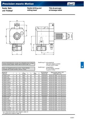 64 48 L2 L1 ø30h6 Precision meets Motion Radial Bohr- Radial drilling and Tête de perçage und Fräskopf milling head et fraisage radial 64 x d x1 Innere Kühlmittelzufuhr. Zusatz IK an Bestellnummer anfügen.Central cooling supply. Please add IK behind order no.AusführungR:wiegezeichnetright hand design as shownà droite suivant croquis Ausführung L: spiegelbildlich 5 Auch mit Doppelverzahnung (Lizenz Traub) lieferbar.Available with double seration (licence Traub).left hand design reversedà gauche inversé Bestell Nr.Order No. i x x1 nmax[1/min]L1 L2 Tmax[Nm] d SchlüsselsatzWrench-setSpannzange (siehe 1.27)Collet (see 1.27) 60.3020 CTXR 1:1 55 81 6000 27 62 25 35 GS30/HS40 RD/ER 20 428E / *ET1-20 (2-13) 60.3020 CTXL 1:1 55 81 6000 27 62 25 35 GS30/HS40 RD/ER 20 428E / *ET1-20 (2-13) 60.3020 CTXR/1 1:2 55 81 12000 27 62 16 35 GS30/HS40 RD/ER 20 428E / *ET1-20 (2-13) 60.3020 CTXL/1 1:2 55 81 12000 27 62 16 35 GS30/HS40 RD/ER 20 428E / *ET1-20 (2-13) 60.3020 CTXR/2 2:1 55 81 4000 27 62 32 35 GS30/HS40 RD/ER 20 428E / *ET1-20 (2-13) 60.3020 CTXL/2 2:1 55 81 4000 27 62 32 35 GS30/HS40 RD/ER 20 428E / *ET1-20 (2-13) 60.3020L CTXR 1:1 100 126 6000 27 62 25 35 GS30/HS40 RD/ER 20 428E / *ET1-20 (2-13) 60.3020L CTXL 1:1 100 126 6000 27 62 25 35 GS30/HS40 RD/ER 20 428E / *ET1-20 (2-13) 60.3020L CTXR/1 1:2 100 126 12000 27 62 16 35 GS30/HS40 RD/ER 20 428E / *ET1-20 (2-13) 60.3020L CTXL/1 1:2 100 126 12000 27 62 16 35 GS30/HS40 RD/ER 20 428E / *ET1-20 (2-13) 60.3020L CTXR/2 2:1 100 126 4000 27 62 32 35 GS30/HS40 RD/ER 20 428E / *ET1-20 (2-13) 60.3020L CTXL/2 2:1 100 126 4000 27 62 32 35 GS30/HS40 RD/ER 20 428E / *ET1-20 (2-13) 60.3025 CTXR 1:1 55 81 6000 28 63 25 42 225/HS40 RD/ER 25 430E / *ET1-25 (2-16) 60.3025 CTXL 1:1 55 81 6000 28 63 25 42 225/HS40 RD/ER 25 430E / *ET1-25 (2-16) 60.3025 CTXR/2 2:1 55 81 4000 28 63 32 42 225/HS40 RD/ER 25 430E / *ET1-25 (2-16) 60.3025 CTXL/2 2:1 55 81 4000 28 63 32 42 225/HS40 RD/ER 25 430E / *ET1-25 (2-16) 60.3025L CTXR 1:1 100 126 6000 28 63 25 42 225/HS40 RD/ER 25 430E / *ET1-25 (2-16) 60.3025L CTXL 1:1 100 126 6000 28 63 25 42 225/HS40 RD/ER 25 430E / *ET1-25 (2-16) 60.3025L CTXR/2 2:1 100 126 4000 28 63 32 42 225/HS40 RD/ER 25 430E / *ET1-25 (2-16) 60.3025L CTXL/2 2:1 100 126 4000 28 63 32 42 225/HS40 RD/ER 25 430E / *ET1-25 (2-16) * Zum Gewindeschneiden siehe Kapitel 8, Seite 12 * For tapping see chapter 8, page 12. 5.30.3