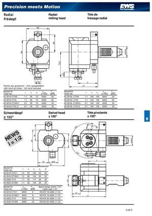 64 64 48 48 73,5 17 42ød ø30h6 ø30h6 Precision meets Motion Radial Radial Tête de Fräskopf milling head fraisage radial 64 ø16 x Rechts wie gezeichnet - links spiegelbildlich x1 right hand as shown - left hand reversed Bestell Nr.Order No. i x x1 nmax[1/min]Tmax[Nm] Bestell Nr.Order No. i x x1 nmax[1/min]Tmax[Nm] 62.3016 CTXR 1:1 55 70 6000 25 62.3016L CTXR 1:1 100 125 6000 25 62.3016 CTXL 1:1 55 70 6000 25 62.3016L CTXL 1:1 100 125 6000 25 62.3016 CTXR/2 2:1 55 70 4000 32 62.3016L CTXR/2 2:1 100 125 4000 32 62.3016 CTXL/2 2:1 55 70 4000 32 62.3016L CTXL/2 2:1 100 125 4000 32 Schwenkkopf Swivel head Tête pivotante ± 105° ± 105° ± 105° 5 105 NiE=W1S:2 105 x 32 28,5 81 Bestell Nr.Order No. i x x1 x2 d 63.3016 CTX/1 1:2 53 102 25 32 63.3016 GT300/1 1:2 85 134 25 32 63.3020 CTX 1:1 60 117 26 35 63.3020 GT300 1:1 92 149 26 35 Bestell Nr. nmax Tmax Spannzange (siehe 1.27) Order No. [1/min] [Nm] Collet (see 1.27) 63.3016 CTX/1 9000 8 RD/ER 16 426E (1-10) x2 63.3016 GT300/1 9000 8 RD/ER 16 426E (1-10) x1 63.3020 CTX 5000 16 RD/ER 20 428E (1-13) 63.3020 GT300 5000 16 RD/ER 20 428E (1-13) 5.30.5