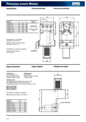 x124 50 x1 x2 Precision meets Motion Kombihalter Combi toolholder Porte outil combiné 70 76 35 Bestell Nr.Order No. d1 x1 x2 Kühlungcoolant 17.4025 CTX 25 100 125 17.4032 CTX 32 100 125 Innen- und 17.4040 CTX 40 100 125 Außenkühlung 17.4025 L CTX 25 120 145 Inside and outside 17.4032 L CTX 32 120 145 cooling 17.4040 L CTX 40 120 145 Reduzierhülsen und Einsätze siehe Seite 1.20 und 1.39 Reducing sleeves and accessories see page 1.20 and 1.39 Ausrichtleiste auf Maschine angepasst. Adjusting plate according to the machine. ø40 Capto-Aufnahme Capto adaptor Adapteur de capto Ausführung L Ausführung R Links wie gezeichnet spiegelbildlich ø40 left hand design as shown right hand design reversed à gauche suivant croquis à droite inversé Ausführung RL mit doppelverzahntem DIN-Schaft (Lizenz Traub) with doubletoothed DIN shaft (licence Traub) universelle pour broche et contre broche (licence Traub) ABS - auf Anfrage ABS - on request Ausrichtleiste auf Maschine angepasst. Adjusting plate according to the machine. Bestell Nr.Order No. Capto x1 19.40C4 CTX L C4 100 Lizenz Sandvik 19.40C4 CTX R C4 100 19.40C4 CTX RL C4 100 19.40C4 L CTX L C4 120 19.40C4 L CTX R C4 120 19.40C4 L CTX RL C4 120 5. 721