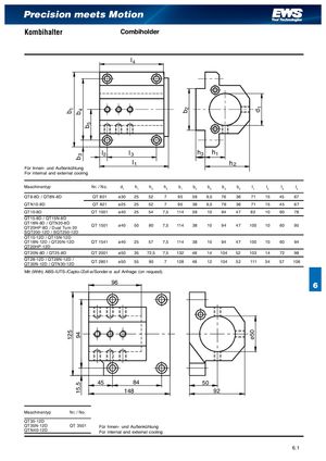 b125 b"b!9415,5 b# b ø50 d Precision meets Motion Kombihalter Combiholder l" l l! h! h l h Für Innen- und Außenkühlung For internal and external cooling Maschinentyp Nr. / No. d1 h1 h2 h3 b1 b2 b3 b4 b5 l1 l2 l3 l4 QT8-8D / QT8N-8D QT 801 ø30 25 52 7 95 38 9,5 76 36 71 15 45 67 QTN10-8D QT 821 ø25 25 52 7 95 38 9,5 76 36 71 15 45 67 QT10-8D QT 1001 ø40 25 54 7,5 114 38 10 94 47 82 10 60 78 QT15-8D / QT15N-8D QT18N-8D / QTN20-8DQT20HP-8D / Dual Turn 20QT 1501ø40 50 80 7,5 114 38 10 94 47 100 10 60 95 SQT200-12D / SQT250-12D QT15-12D / QT15N-12D QT18N-12D / QT20N-12D QT 1541 ø40 25 57 7,5 114 38 10 94 47 100 10 60 94 QT20HP-12D QT20N-8D / QT25-8D QT 2001 ø50 35 72,5 7,5 132 48 14 104 52 103 14 72 98 QT28-12D / QT28N-12D /QT30N-12D / QTN30-12DQT 2801ø50 55 90 7 128 48 12 104 52 111 34 57 106 Mit (With) ABS-/UTS-/Capto-/Zoll-ø/Sonder-ø auf Anfrage (on request). 96 6 45 84 50 148 92 Maschinentyp Nr. / No. QT35-12D QT35N-12D QT 3501 Für Innen- und Außenkühlung QTN40-12D For internal and external cooling 6. 1