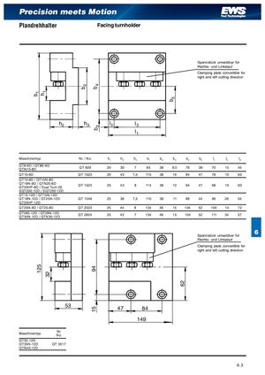 b h12532 b b"b!9415 b# 62 Precision meets Motion Plandrehhalter Facing turnholder Spannstück umsetzbar für Rechts- und Linkslauf Clamping plate convertible for right and left cutting direction h h! l l! l Maschinentyp Nr. / No. h1 h2 h3 b1 b2 b3 b4 b5 l1 l2 l3 QT8-8D / QT8N-8DQTN10-8D QT 829 20 30 7 95 38 9,5 76 36 70 15 45 QT10-8D QT 1023 20 40 7,5 115 38 10 94 47 78 10 60 QT15-8D / QT15N-8D QT18N-8D / QTN20-8DQT20HP-8D / Dual Turn 20QT 1523 25 43 8 114 38 10 94 47 98 10 60 SQT200-12D / SQT250-12D QT15-12D / QT15N-12D QT18N-12D / QT20N-12D QT 1549 25 38 7,5 110 38 11 88 44 96 26 55 QT20HP-12D QT20N-8D / QT25-8D QT 2023 25 44 8 134 48 15 104 52 100 14 72 QT285-12D / QT28N-12DQT30N-12D / QTN30-12DQT 2824 25 45 7 134 48 15 104 52 111 34 57 6 Spannstück umsetzbar für Rechts- und LInkslauf Clamping plate convertible for right and left cutting direction 53 47 84 149 Maschinentyp Nr.No. QT35-12D QT35N-12D QT 3517 QTN40-12D 6. 3
