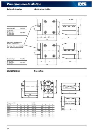 ## 1-70 70 ""'"$ $$$"dD !& Precision meets Motion Außendrehhalter Outside turnholder Maschinentyp Nr. / No. QT28-12D QT28N-12DQT30N-12D QT 2823 QTN30-12D $ #% && ! Spannstück umsetzbar für Rechts- und Linkslauf Clamping plate convertible for right and left cutting direction Maschinentyp Nr. / No. QT35-12D $" &" QT35N-12D QT 3518 QT40-12D $$ Stangengreifer Bar pickup l l2 l1 50 Stangenregister Schaft Best-Nr. A B L1 L2 Best-Nr. d D l L SG-10 70 70 78 61 SGS-20 ø20 --- 63 --- SG-10 70 50 78 61 SGS-25 ø25 --- 63 --- 14 L SG-10 70 50 78 61 SGS-30 ø30 --- 63 --- SG-10 70 50 78 61 SGS-32 ø32 --- 63 --- SG-10 70 50 78 61 SGS-40 ø40 --- 63 --- SG-10 70 50 78 61 SGS-50 ø50 --- 63 --- 6. 4