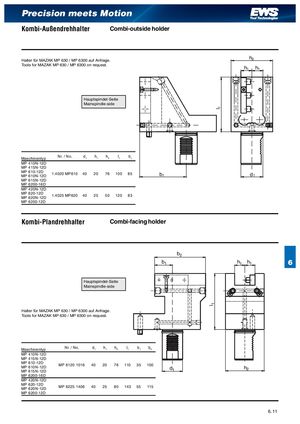 l l1 Precision meets Motion Kombi-Außendrehhalter Combi-outside holder Halter für MAZAK MP 630 / MP 6300 auf Anfrage. h2 Tools for MAZAK MP 630 / MP 6300 on request. h1 h1 Hauptspindel-Seite Mainspindle-side Maschinentyp Nr. / No. d1 h1 h2 l1 b1 MP 410N-12D MP 415N-12D MP 610-12DMP 610N-12D1.4020 MP61040 20 76 100 85 b1 d1 MP 615N-12D MP 6200-16D MP 420N-12D MP 620-12DMP 620N-12D1.4025 MP62040 25 50 120 83 MP 6200-12D Kombi-Plandrehhalter Combi-facing holder b b h h 6 Hauptspindel-Seite Mainspindle-side Halter für MAZAK MP 630 / MP 6300 auf Anfrage. Tools for MAZAK MP 630 / MP 6300 on request. Maschinentyp Nr. / No. d1 h1 h2 l1 b1 b2 MP 410N-12D MP 415N-12D MP 610-12DMP 610N-12DMP 6120 1016 40 20 76 110 35 100MP 615N-12Dd h MP 6200-16D MP 420N-12D MP 620-12DMP 620N-12DMP 6225 1406 40 25 80 143 55 115 MP 6200-12D 6. 11