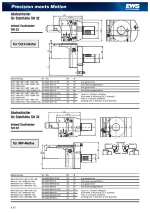 68,754 65 SH32SH328,3 7081 8,358 Bø40 Bø4081 10056 100 Precision meets Motion Abstechhalter 137 für Stahlhöhe SH 32 110,5 Infeed Toolholder SH 32 für SQT-Reihe Maschinentyp Nr. / No. SH B SQT 10M-12D / SQT 15M-16D 32.4032 SQT10 ÜK 32 76 wie gezeichnet SQT 15M-16D / SQT 200M-16D 32.4032 SQT10 32 76 Schneide spiegelbildlich SQT 250M-16DSQT 15M-12D / SQT 18M-12D32.4032 SQT15 ÜK 32 84 wie gezeichnet SQT 200M-12D / SQT 250M-12D 32.4032 SQT15 32 84 Schneide spiegelbildlich SQT 10M-12D / SQT 15M-16D 32.4032 SQT10 LÜKSQT 15M-16D / SQT 200M-16DSQT 250M-16DSQT 15M-12D / SQT 18M-12D32.4032 SQT10 L32.4032 SQT15 LÜKSQT 200M-12D / SQT 250M-12D32.4032 SQT15 L3276Auch in L-Version verfügbar3276(Schneide in Richtung zur 2. Spindel)3284Also in L-Version available3284(Cutting tool in direction to 2nd Spindle) Abstechhalter 165 123,5 für Stahlhöhe SH 32 Infeed Toolholder SH 32 für MP-Reihe Einbaulage Maschinentyp Nr. / No. SH B MP410N-12D / MP 415N-12D 32.4032 MP610 ÜK 32 76 wie gezeichnet MP610-12D / MP6200-16D 32.4032 MP610 32 76 Schneide spiegelbildlich MP420N-12D / MP620-12D 32.4032 MP620 ÜK 32 84 wie gezeichnet MP620N-12D / MP6200-12D 32.4032 MP620 32 84 Schneide spiegelbildlich MP410N-12D / MP415N-12D 32.4032 MP610 LÜK 32 76 Auch in L-Version verfügbar MP610-12D / MP6200-16D 32.4032 MP610 L 32 76 (Schneide in Richtung zur 2. Spindel) MP420N-12D / MP620-12D 32.4032 MP620 LÜK 32 84 Also in L-Version available MP620N-12D / MP6200-12D 32.4032 MP620 L 32 84 (Cutting tool in direction to 2nd Spindle) 6. 12