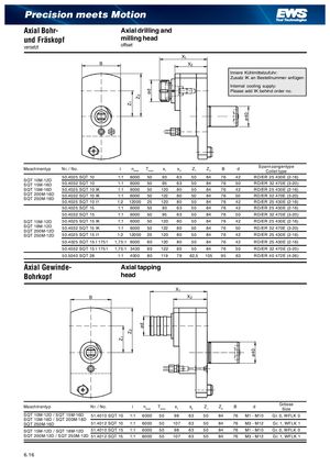 Z ZZ Z ød ød ø40 ø40 Precision meets Motion Axial Bohr- Axial drilling and und Fräskopf milling head versetzt offset X B X Innere Kühlmittelzufuhr: Zusatz IK an Bestellnummer anfügen Internal cooling supply: Please add IK behind order no. Maschinentyp Nr. / No. i nmax Tmax x1 x2 Z1 Z2 B d SpannzangentypeCollet type 50.4025 SQT 10 1:1 6000 50 93 63 50 84 76 42 RD/ER 25 430E (2-16) SQT 10M-12DSQT 15M-16D50.4032 SQT 10 1:1 6000 50 95 63 50 84 76 50 RD/ER 32 470E (3-20) SQT 15M-16D 50.4025 SQT 10 IK 1:1 6000 50 120 80 50 84 76 42 RD/ER 25 430E (2-16) SQT 200M-16DSQT 250M-16D50.4032 SQT 10 IK 1:1 6000 50 122 80 50 84 76 50 RD/ER 32 470E (3-20) 50.4025 SQT 10 I1 1:2 12000 25 120 80 50 84 76 42 RD/ER 25 430E (2-16) 50.4025 SQT 15 1:1 6000 50 93 63 50 84 76 42 RD/ER 25 430E (2-16) 50.4032 SQT 15 1:1 6000 50 95 63 50 84 76 50 RD/ER 32 470E (3-20) SQT 15M-12D 50.4025 SQT 15 IK 1:1 6000 50 120 80 50 84 76 42 RD/ER 25 430E (2-16) SQT 18M-12DSQT 200M-12D50.4032 SQT 15 IK 1:1 6000 50 122 80 50 84 76 50 RD/ER 32 470E (3-20) SQT 250M-12D 50.4025 SQT 15 I1 1:2 12000 25 120 80 50 84 76 42 RD/ER 25 430E (2-16) 50.4025 SQT 15 I 1751 1,75:1 6000 60 120 80 50 84 76 42 RD/ER 25 430E (2-16) 50.4032 SQT 15 I 1751 1,75:1 3430 60 122 80 50 84 76 50 RD/ER 32 470E (3-20) 50.5040 SQT 28 1:1 4000 80 119 79 62,5 105 95 63 RD/ER 40 472E (4-26) Axial Gewinde- Axial tapping Bohrkopf head X B X Maschinentyp Nr. / No. i nmax Tmax x1 x2 Z1 Z2 B d GrösseSize SQT 10M-12D / SQT 15M-16D 51.4010 SQT 10 1:1 6000 50 98 63 50 84 76 M1 - M10 Gr. 0, WFLK 0 SQT 15M-16D / SQT 200M-16D SQT 250M-16D 51.4012 SQT 10 1:1 6000 50 107 63 50 84 76 M3 - M12 Gr. 1, WFLK 1 SQT 15M-12D / SQT 18M-12D 51.4010 SQT 15 1:1 6000 50 98 63 50 84 76 M1 - M10 Gr. 0, WFLK 0 SQT 200M-12D / SQT 250M-12D 51.4012 SQT 15 1:1 6000 50 107 63 50 84 76 M3 - M12 Gr. 1, WFLK 1 6. 16