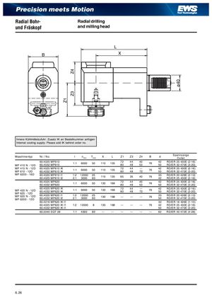 Z1 Z4Z3 ø40 Precision meets Motion Radial Bohr- Radial drilling und Fräskopf and milling head L B X Innere Kühlmittelzufuhr: Zusatz IK an Bestellnummer anfügen Internal cooling supply: Please add IK behind order no. Maschinentyp Nr. / No. i nmax Tmax X L Z1 Z3 Z4 B d SpannzangeCollet 60.4025 MP610MP 410 N - 12D60.4032 MP6101:1600050110 135 7280 4448 4053 76 42 RD/ER 25 430E (2-16)50RD/ER 32 470E (3-20) MP 415 N - 12D 60.4025 MP610 IKMP 610 - 12D60.4032 MP610 IK1:1600050110135 7280 4448 ---72 76 42 RD/ER 25 430E (2-16)50RD/ER 32 470E (3-20) MP 6200 - 16D 60.4020 MP610 I160.4025 MP610 I21:212000 252:1300060110135 65 35 40 76 35 RD/ER 20 428E (2-13)42RD/ER 25 430E (2-16) 60.4025 MP62060.4032 MP6201:1 6000 50 130 168 7280 4448 4053 76 42 RD/ER 25 430E (2-16)50RD/ER 32 470E (3-20) MP 420 N - 12DMP 620 - 12DMP 620 N - 12DMP 6200 - 12D60.4025 MP620 IK60.4032 MP620 IK60.4020 MP620 I160.4032 MP620 I21:160005013016872804448---727642RD/ER 25 430E (2-16)50RD/ER 32 470E (3-20)1:212000252:1300060130168---------7635RD/ER 20 428E (2-13)50RD/ER 32 470E (3-20) 60.4016 MP620 IK I1 32 RD/ER 16 426E (1-10) 60.4025 MP620 IK I1 1:2 12000 8 130 168 --- --- --- 76 42 RD/ER 25 430E (2-16) 60.4032 MP620 IK I1 50 RD/ER 32 470E (3-20) 60.5040 SQT 28 1:1 4000 80 --- --- --- --- --- --- 63 RD/ER 40 472E (4-26) 6. 26