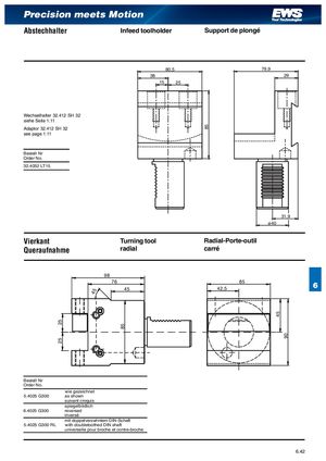 2525 45 85 85 45 90 Precision meets Motion Abstechhalter Infeed toolholder Support de plongé 80,5 79,9 38 29 15 25 Wechselhalter 32.412 SH 32 siehe Seite 1.11 Adaptor 32.412 SH 32 see page 1.11 Bestell Nr Order No. 32.4032 LT15 31,9 ø40 Vierkant Turning tool Radial-Porte-outil Queraufnahme radial carré 98 76 45 8542,5 6 Bestell Nr Order No. wie gezeichnet 5.4025 G300 as shown suivant croquis spiegelbildlich 6.4025 G300 reversed inversé mit doppelverzahntem DIN-Schaft 5.4025 G300 RL with doubletoothed DIN shaft universelle pour broche et contre-broche 6.42