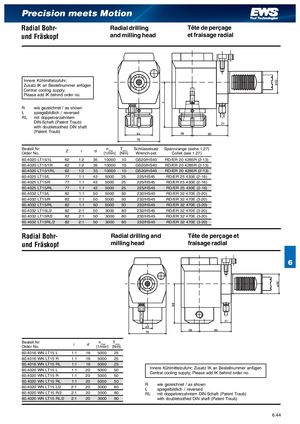 z ø40 Precision meets Motion Radial Bohr- Radial drilling Tête de perçage und Fräskopf and milling head et fraisage radial Innere Kühlmittelzufuhr; Zusatz IK an Bestellnummer anfügen Central cooling supply; Please add IK behind order no. R wie gezeichnet / as shown L spiegelbildlich / reversed RL mit doppelverzahntem DIN-Schaft (Patent Traub) 21 with doubletoothed DIN shaft (Patent Traub) øx 38 90 76 Bestell NrOrder No. Z i d nmax Tmax Schlüsselsatz Spannzange (siehe 1.27)[1/min][Nm]Wrench-setCollet (see 1.27) 60.4020 LT15/1L 62 1:2 35 10000 10 GS20/HS40 RD/ER 20 4285R (2-13) 60.4020 LT15/1R 62 1:2 35 10000 10 GS20/HS40 RD/ER 20 4285R (2-13) 60.4020 LT15/1RL 62 1:2 35 10000 10 GS20/HS40 RD/ER 20 4285R (2-13) 60.4025 LT15/L 77 1:1 42 5000 25 225/HS45 RD/ER 25 430E (2-16) 60.4025 LT15/R 77 1:1 42 5000 25 225/HS45 RD/ER 25 430E (2-16) 60.4025 LT15/RL 77 1:1 42 5000 25 225/HS45 RD/ER 25 430E (2-16) 60.4032 LT15/L 82 1:1 50 5000 50 232/HS45 RD/ER 32 470E (3-20) 60.4032 LT15/R 82 1:1 50 5000 50 232/HS45 RD/ER 32 470E (3-20) 60.4032 LT15/RL 82 1:1 50 5000 50 232/HS45 RD/ER 32 470E (3-20) 60.4032 LT15L/2 82 2:1 50 3000 80 232/HS45 RD/ER 32 470E (3-20) 60.4032 LT15R/2 82 2:1 50 3000 80 232/HS45 RD/ER 32 470E (3-20) 60.4032 LT15RL/2 82 2:1 50 3000 80 232/HS45 RD/ER 32 470E (3-20) Radial Bohr- Radial drilling and Tête de perçage et und Fräskopf milling head fraisage radial 6 ød 76 Bestell NrOrder No. i d [1n/mmaixn] [TNmmax] 60.4016 WN LT15 L 1:1 16 5000 25 60.4016 WN LT15 R 1:1 16 5000 25 60.4016 WN LT15 RL 1:1 16 5000 25 60.4020 WN LT15 L 1:1 20 5000 50 Innere Kühlmittelzufuhr; Zusatz IK an Bestellnummer anfügenCentral cooling supply; Please add IK behind order no. 60.4020 WN LT15 R 1:1 20 5000 50 60.4020 WN LT15 RL 1:1 20 5000 50 60.4020 WN LT15 L/2 2:1 20 3000 80 R wie gezeichnet / as shownLspiegelbildlich/reversed 60.4020 WN LT15 R/2 2:1 20 3000 80 RL mit doppelverzahntem DIN-Schaft (Patent Traub) 60.4020 WN LT15 RL/2 2:1 20 3000 80 with doubletoothed DIN shaft (Patent Traub) 6.44