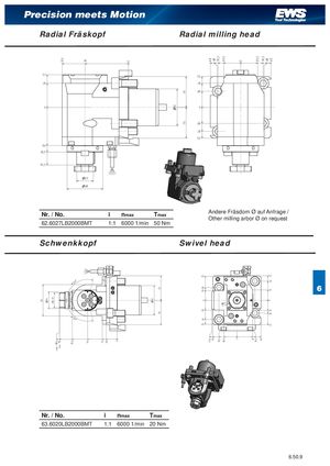 P 48 NBY NJO P P Precision meets Motion Radial Fräskopf Radial milling head P P Nr. / No. i nmax Tmax Andere Fräsdorn Ø auf Anfrage / Other milling arbor Ø on request 62.6027LB2000BMT 1:1 6000 1/min 50 Nm Schwenkkopf Swivel head Bn 6 P Bn Nr. / No. i nmax Tmax 63.6020LB2000BMT 1:1 6000 1/min 20 Nm 6.50.9